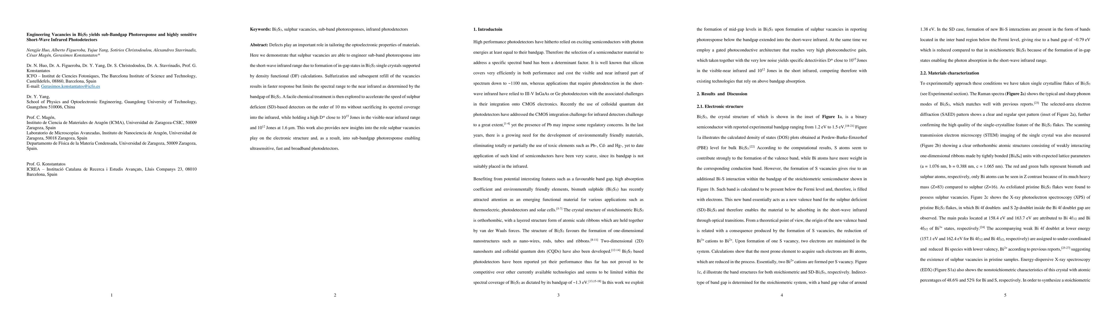 This paper demonstrates that sulfur vacancies in Bi2S3 single crystals can engineer sub-bandgap photoresponse in the short-wave infrared range, leading to highly sensitive photodetectors. Chemical treatments enhance response speed while maintaining spectral coverage and high detectivity.