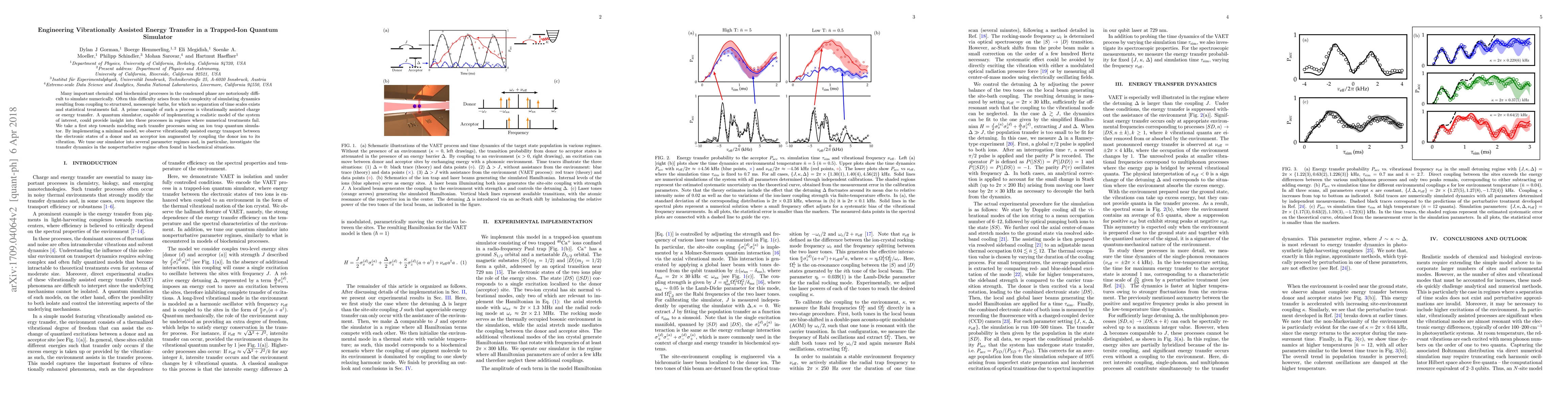 This paper explores the use of a trapped-ion quantum simulator to model vibrationally-assisted energy transfer, addressing the challenge of simulating complex dynamics in chemical processes. The study demonstrates vibrationally assisted energy transport in a donor-acceptor system and investigates the nonperturbative regime, providing insights where numerical simulations fail.