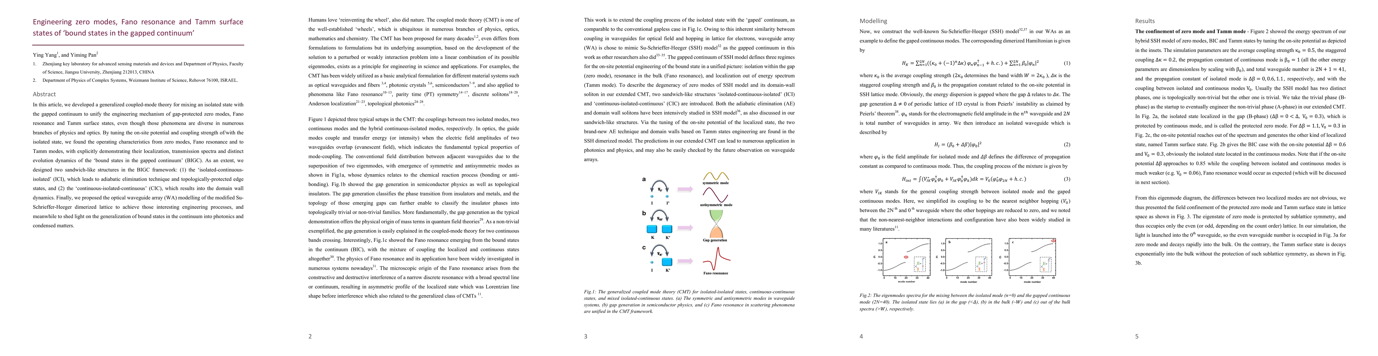 This paper develops a coupled-mode theory to unify the mechanisms of zero modes, Fano resonance, and Tamm surface states in 'bound states in the gapped continuum' (BIGC). It demonstrates the engineering of these phenomena through tuning potential and coupling strength, and proposes optical waveguide array models to generalize these concepts in photonics and condensed matter.
