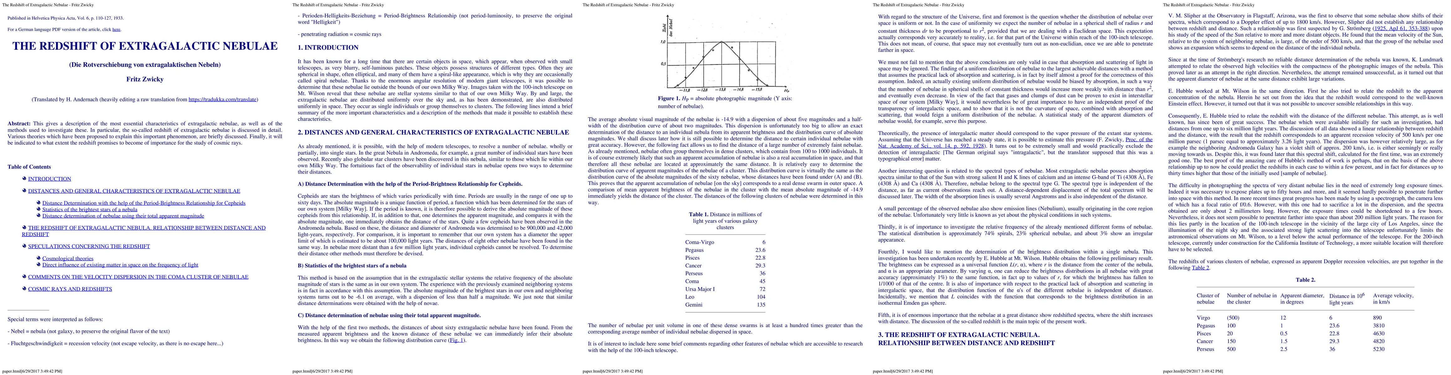 article on "The Redshift of Extragalactic Nebulae", published in German in