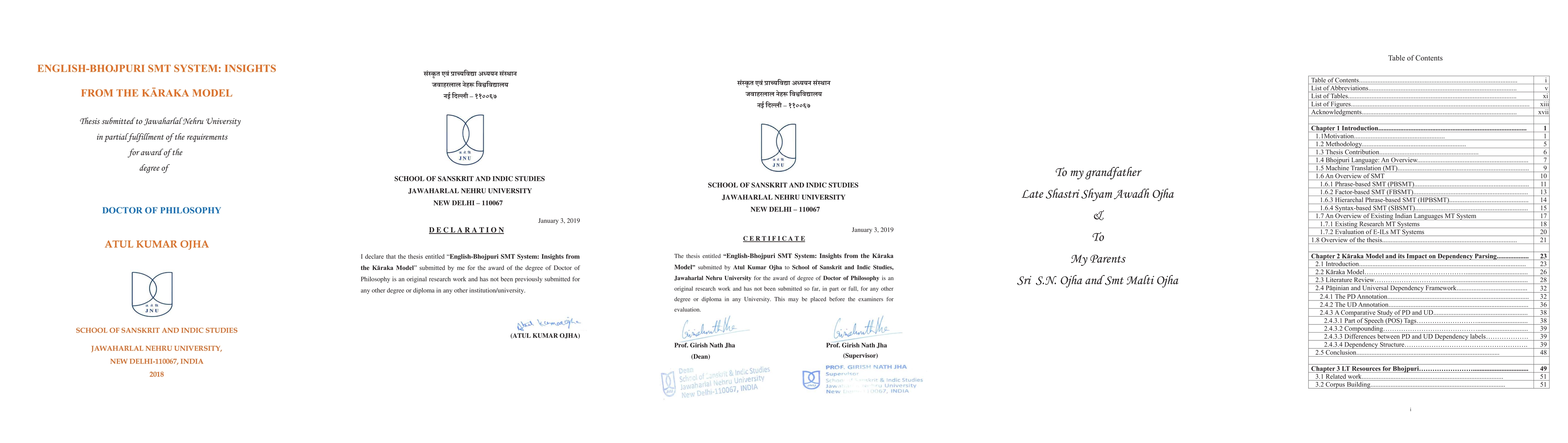 This thesis has been divided into six chapters namely: Introduction, Karaka Model and it impacts on Dependency Parsing, LT Resources for Bhojpuri, English-Bhojpuri SMT System: Experiment, Evaluation of EB-SMT System, and Conclusion. Chapter one introduces this PhD research by detailing the motivation of the study, the methodology used for the study and the literature review of the existing MT related work in Indian Languages. Chapter two talks of the theoretical background of Karaka and Karaka model. Along with this, it talks about previous related work. It also discusses the impacts of the Karaka model in NLP and dependency parsing. It compares Karaka dependency and Universal Dependency. It also presents a brief idea of the implementation of these models in the SMT system for English-Bhojpuri language pair.