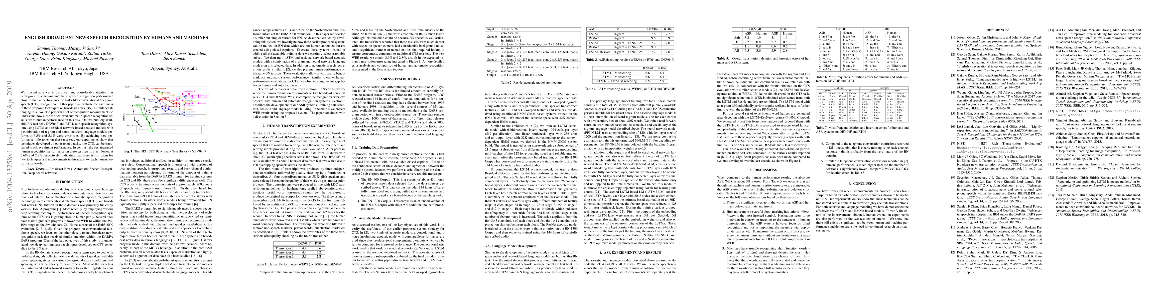 This paper evaluates the transferability of deep learning techniques from conversational telephone speech to broadcast news recognition, achieving a word error rate of 6.5% and 5.9%. Comparatively, the best human recognition performance is 3.6% and 2.8%, indicating potential for further improvements to reach human-level performance.