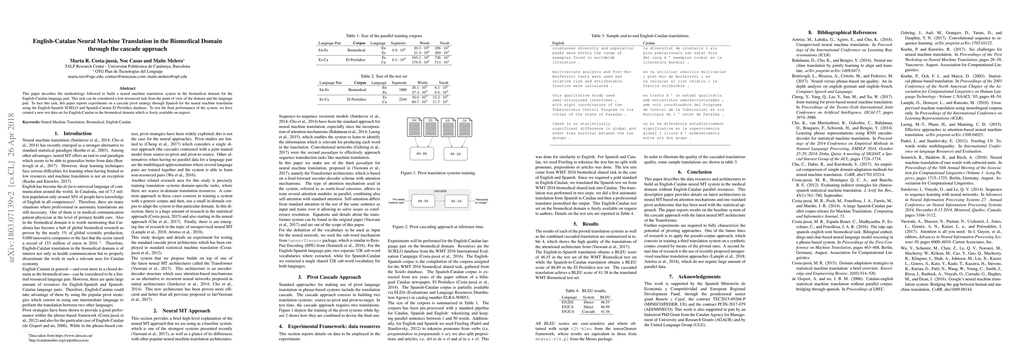 This paper presents a neural machine translation system for the English-Catalan biomedical domain using a cascade pivot strategy through Spanish, leveraging existing SCIELO and El Peri\'odico datasets, and introduces a new test dataset for evaluation. The methodology aims to address the low-resource nature of the English-Catalan language pair in the biomedical field.