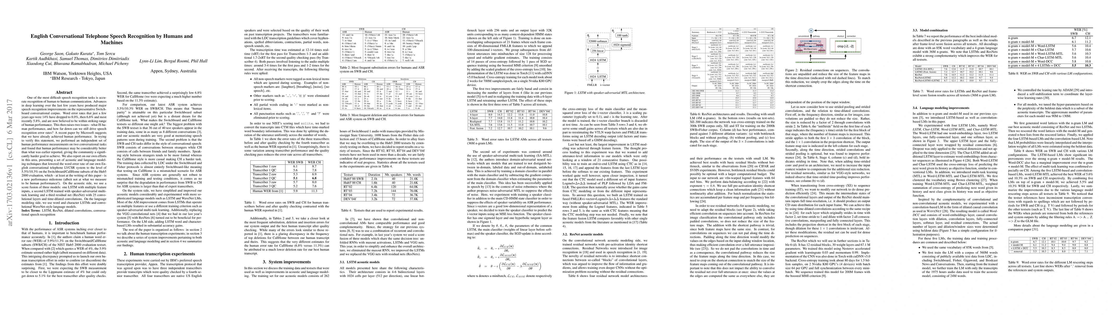 One of the most difficult speech recognition tasks is accurate recognition of human to human communication. Advances in deep learning over the last few years have produced major speech recognition improvements on the representative Switchboard conversational corpus. Word error rates that just a few years ago were 14% have dropped to 8.0%, then 6.6% and most recently 5.8%, and are now believed to be within striking range of human performance. This then raises two issues - what IS human performance, and how far down can we still drive speech recognition error rates? A recent paper by Microsoft suggests that we have already achieved human performance. In trying to verify this statement, we performed an independent set of human performance measurements on two conversational tasks and found that human performance may be considerably better than what was earlier reported, giving the community a significantly harder goal to achieve. We also report on our own efforts in this area, presenting a set of acoustic and language modeling techniques that lowered the word error rate of our own English conversational telephone LVCSR system to the level of 5.5%/10.3% on the Switchboard/CallHome subsets of the Hub5 2000 evaluation, which - at least at the writing of this paper - is a new performance milestone (albeit not at what we measure to be human performance!). On the acoustic side, we use a score fusion of three models: one LSTM with multiple feature inputs, a second LSTM trained with speaker-adversarial multi-task learning and a third residual net (ResNet) with 25 convolutional layers and time-dilated convolutions. On the language modeling side, we use word and character LSTMs and convolutional WaveNet-style language models.