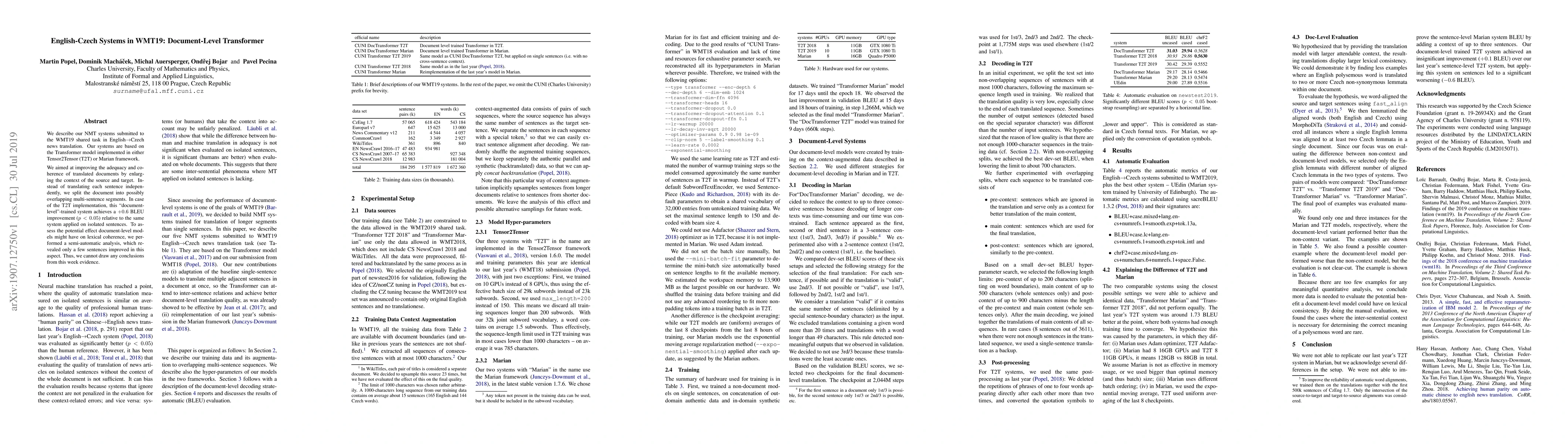 We describe our NMT systems submitted to the WMT19 shared task in English-Czech news translation. Our systems are based on the Transformer model implemented in either Tensor2Tensor (T2T) or Marian framework. We aimed at improving the adequacy and coherence of translated documents by enlarging the context of the source and target. Instead of translating each sentence independently, we split the document into possibly overlapping multi-sentence segments. In case of the T2T implementation, this "document-level"-trained system achieves a $+0.6$ BLEU improvement ($p<0.05$) relative to the same system applied on isolated sentences. To assess the potential effect document-level models might have on lexical coherence, we performed a semi-automatic analysis, which revealed only a few sentences improved in this aspect. Thus, we cannot draw any conclusions from this weak evidence.