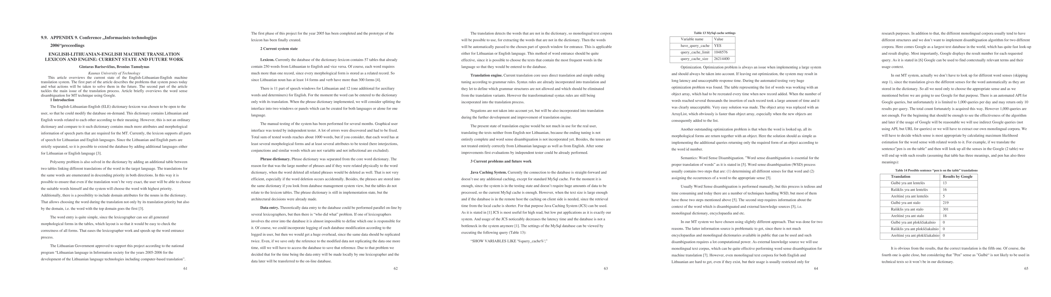 This paper overviews the current state of English-Lithuanian-English machine translation, highlighting problems and proposed solutions for word sense disambiguation using Google's technique. The research aims to improve the system's accuracy and efficiency in translating between Lithuanian and English languages.