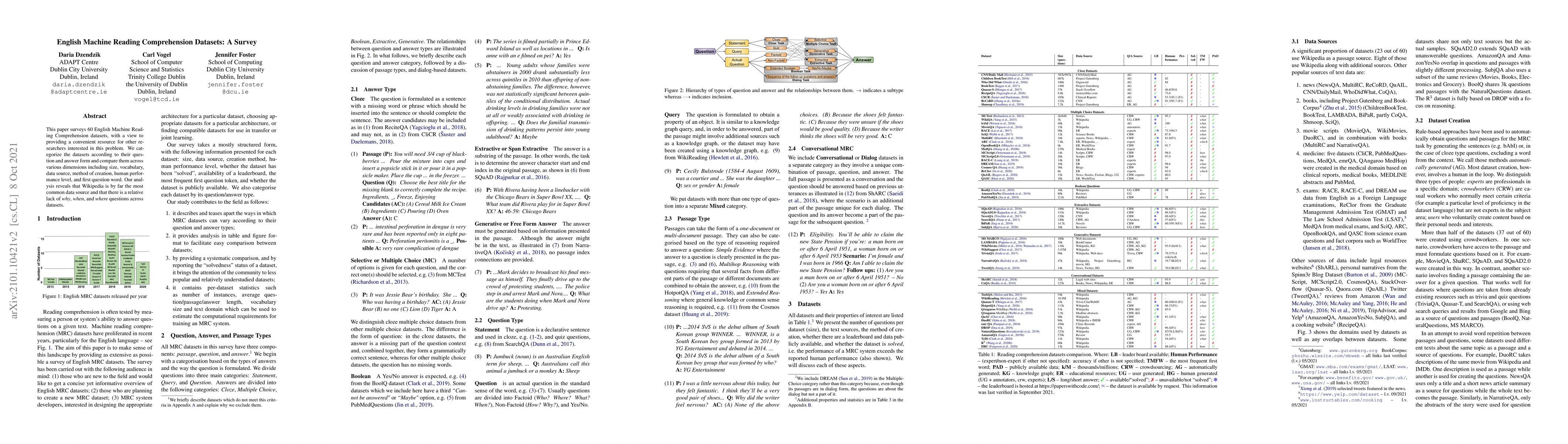 This paper surveys 60 English Machine Reading Comprehension datasets, categorizing them by question types and comparing them across various dimensions. Wikipedia is the most common data source, but there is a notable scarcity of why, when, and where questions.