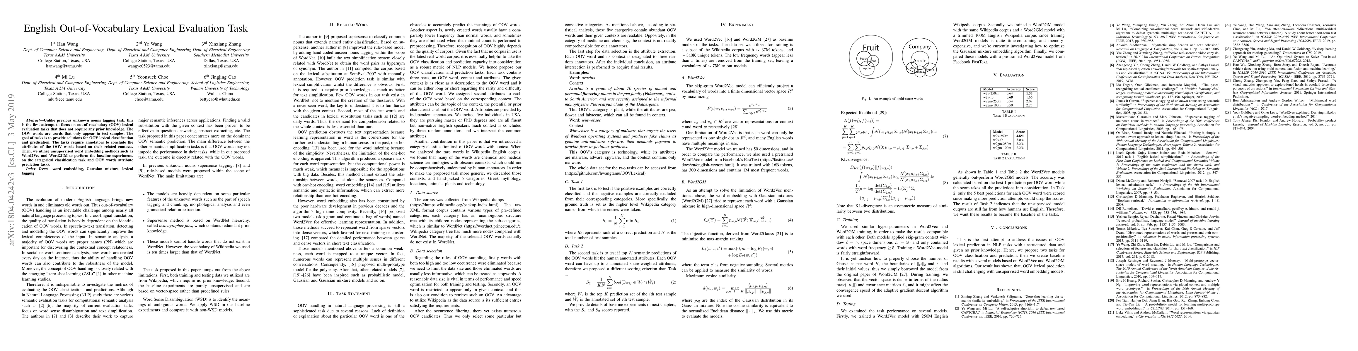 Unlike previous unknown nouns tagging task, this is the first attempt to focus on out-of-vocabulary (OOV) lexical evaluation tasks that do not require any prior knowledge. The OOV words are words that only appear in test samples. The goal of tasks is to provide solutions for OOV lexical classification and prediction. The tasks require annotators to conclude the attributes of the OOV words based on their related contexts. Then, we utilize unsupervised word embedding methods such as Word2Vec and Word2GM to perform the baseline experiments on the categorical classification task and OOV words attribute prediction tasks.