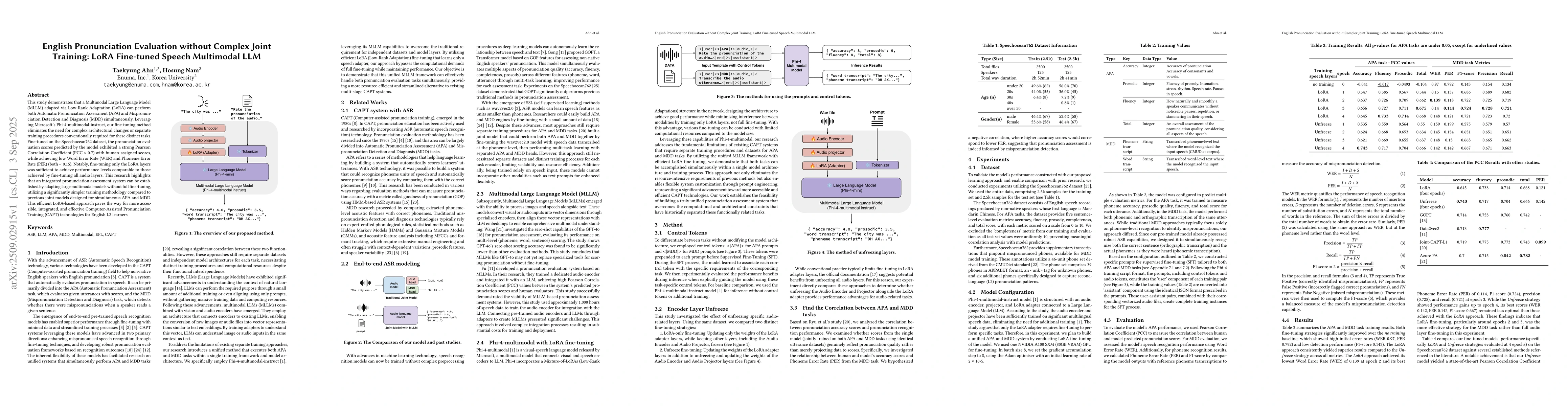 This study demonstrates that a Multimodal Large Language Model (MLLM) adapted via Low-Rank Adaptation (LoRA) can perform both Automatic Pronunciation Assessment (APA) and Mispronunciation Detection and Diagnosis (MDD) simultaneously. Leveraging Microsoft's Phi-4-multimodal-instruct, our fine-tuning method eliminates the need for complex architectural changes or separate training procedures conventionally required for these distinct tasks. Fine-tuned on the Speechocean762 dataset, the pronunciation evaluation scores predicted by the model exhibited a strong Pearson Correlation Coefficient (PCC > 0.7) with human-assigned scores, while achieving low Word Error Rate (WER) and Phoneme Error Rate (PER) (both < 0.15). Notably, fine-tuning only the LoRA layers was sufficient to achieve performance levels comparable to those achieved by fine-tuning all audio layers. This research highlights that an integrated pronunciation assessment system can be established by adapting large multimodal models without full fine-tuning, utilizing a significantly simpler training methodology compared to previous joint models designed for simultaneous APA and MDD. This efficient LoRA-based approach paves the way for more accessible, integrated, and effective Computer-Assisted Pronunciation Training (CAPT) technologies for English L2 learners.