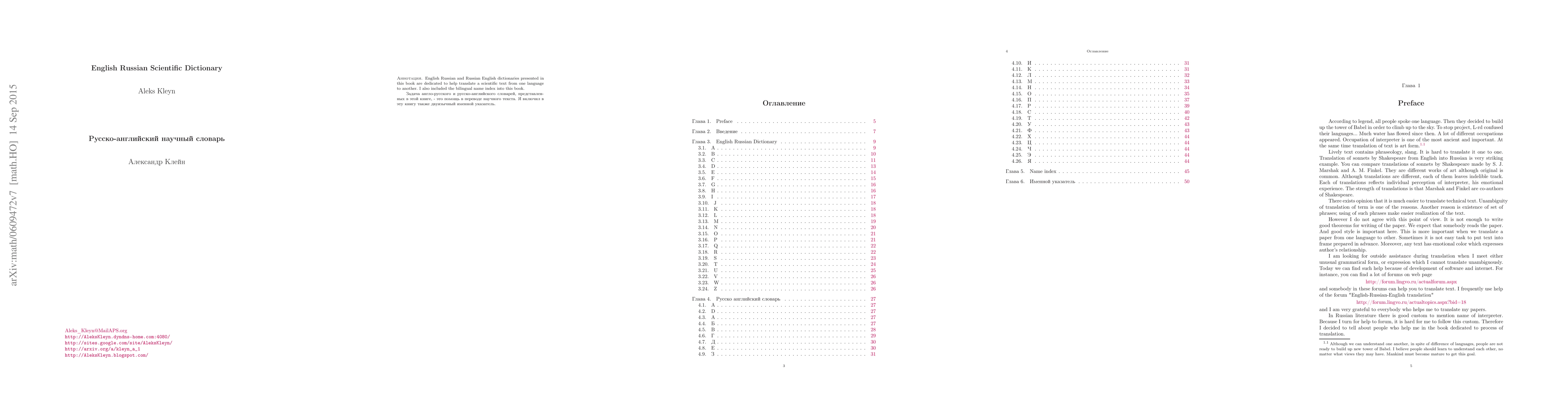 Summary: This paper presents bilingual dictionaries for translating scientific texts between English and Russian, featuring a bilingual name index to aid in cross-language translation. The dictionaries aim to facilitate accurate scientific communication between English and Russian speakers.