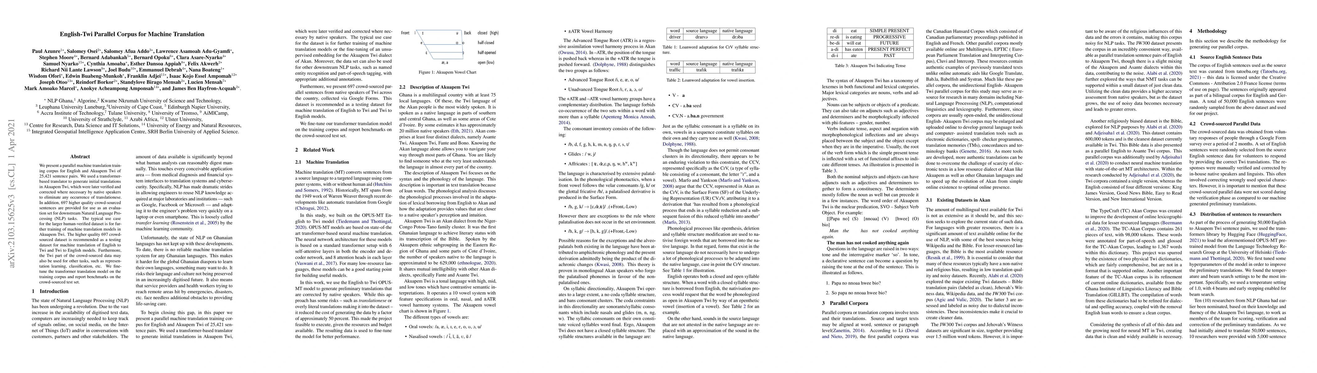This paper introduces a 25,421 sentence pair English-Twi parallel corpus for machine translation, with initial translations generated by a transformer model and verified by native speakers. A subset of 697 higher quality sentences is provided for NLP tasks evaluation.