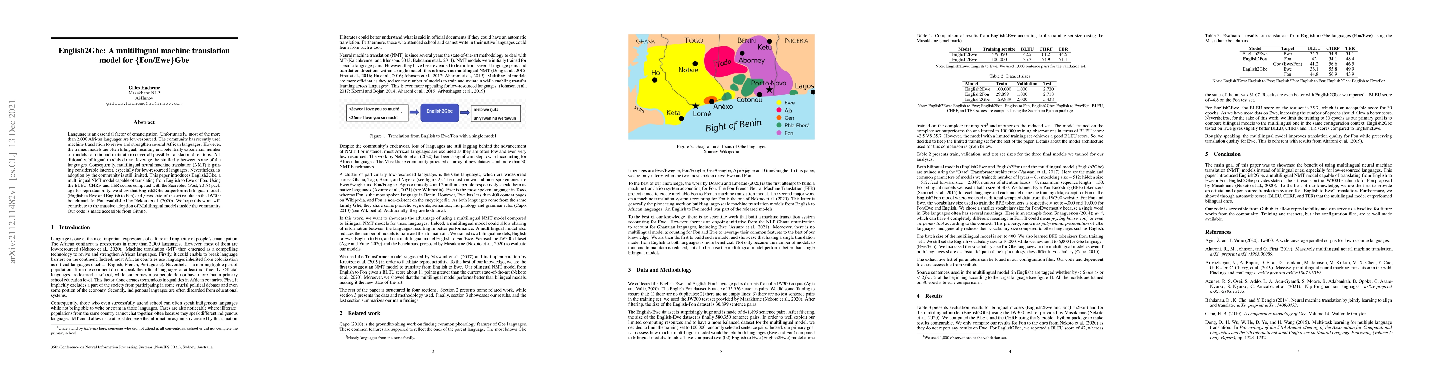 Language is an essential factor of emancipation. Unfortunately, most of the more than 2,000 African languages are low-resourced. The community has recently used machine translation to revive and strengthen several African languages. However, the trained models are often bilingual, resulting in a potentially exponential number of models to train and maintain to cover all possible translation directions. Additionally, bilingual models do not leverage the similarity between some of the languages. Consequently, multilingual neural machine translation (NMT) is gaining considerable interest, especially for low-resourced languages. Nevertheless, its adoption by the community is still limited. This paper introduces English2Gbe, a multilingual NMT model capable of translating from English to Ewe or Fon. Using the BLEU, CHRF, and TER scores computed with the Sacrebleu (Post, 2018) package for reproducibility, we show that English2Gbe outperforms bilingual models (English to Ewe and English to Fon) and gives state-of-the-art results on the JW300 benchmark for Fon established by Nekoto et al. (2020). We hope this work will contribute to the massive adoption of Multilingual models inside the community. Our code is made accessible from Github.