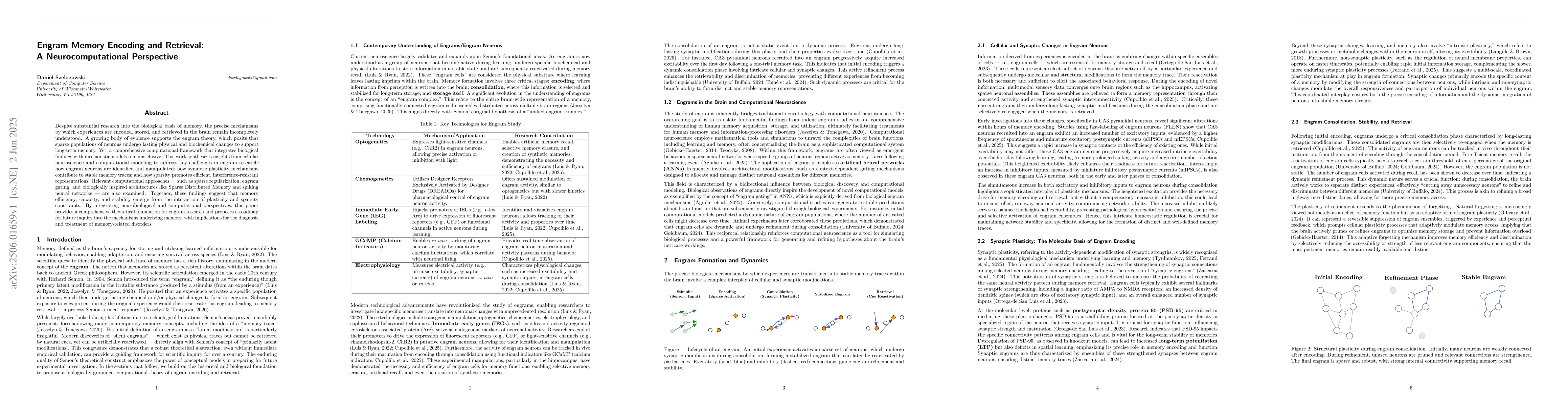 The paper synthesizes insights from cellular neuroscience and computational modeling to address challenges in engram research, examining computational approaches like sparse regularization, engram gating, and biologically inspired architectures.