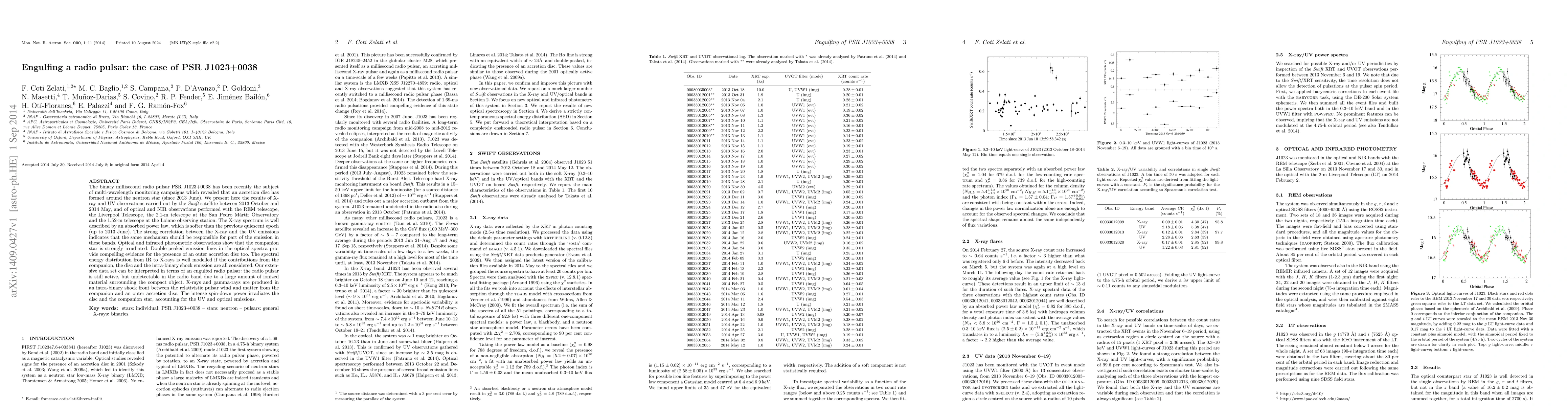 The binary millisecond radio pulsar PSR J1023+0038 has been recently the subject of multiwavelength monitoring campaigns which revealed that an accretion disc has formed around the neutron star (since 2013 June). We present here the results of X-ray and UV observations carried out by the Swift satellite between 2013 October and 2014 May, and of optical and NIR observations performed with the REM telescope, the Liverpool Telescope, the 2.1-m telescope at the San Pedro M\'artir Observatory and the 1.52-m telescope at the Loiano observing station. The X-ray spectrum is well described by an absorbed power law, which is softer than the previous quiescent epoch (up to 2013 June). The strong correlation between the X-ray and the UV emissions indicates that the same mechanism should be responsible for part of the emission in these bands. Optical and infrared photometric observations show that the companion star is strongly irradiated. Double-peaked emission lines in the optical spectra provide compelling evidence for the presence of an outer accretion disc too. The spectral energy distribution from IR to X-rays is well modelled if the contributions from the companion, the disc and the intra-binary shock emission are all considered. Our extensive data set can be interpreted in terms of an engulfed radio pulsar: the radio pulsar is still active, but undetectable in the radio band due to a large amount of ionized material surrounding the compact object. X-rays and gamma-rays are produced in an intra-binary shock front between the relativistic pulsar wind and matter from the companion and an outer accretion disc. The intense spin-down power irradiates the disc and the companion star, accounting for the UV and optical emissions.