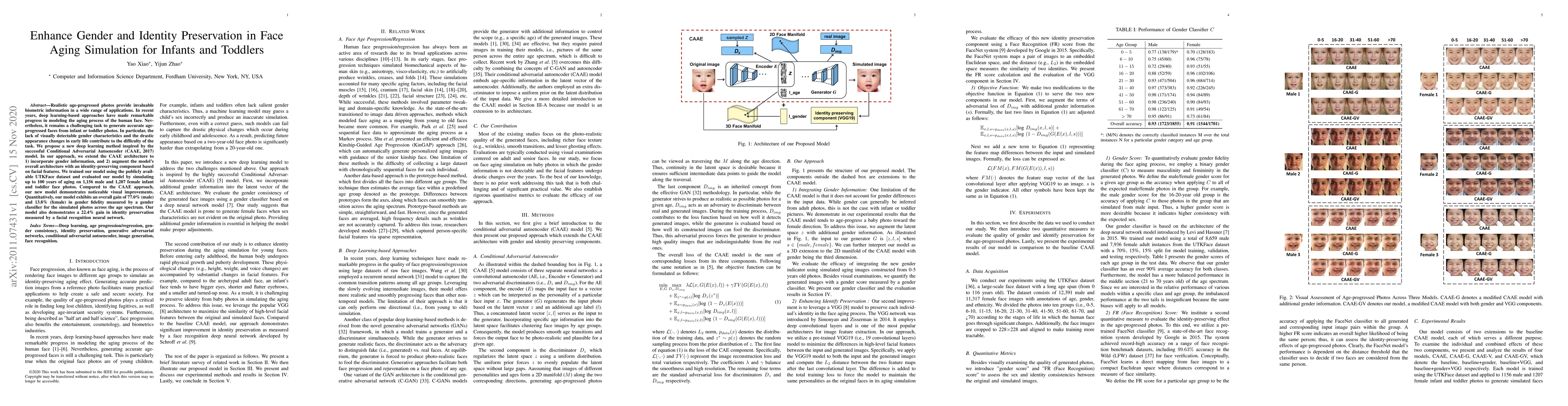 This paper proposes a deep learning method to enhance gender and identity preservation in age-progressed simulations of infant and toddler faces. The new model extends the Conditional Adversarial Autoencoder architecture to incorporate gender information and an identity-preserving component, achieving significant improvements in gender fidelity and identity preservation over existing methods.