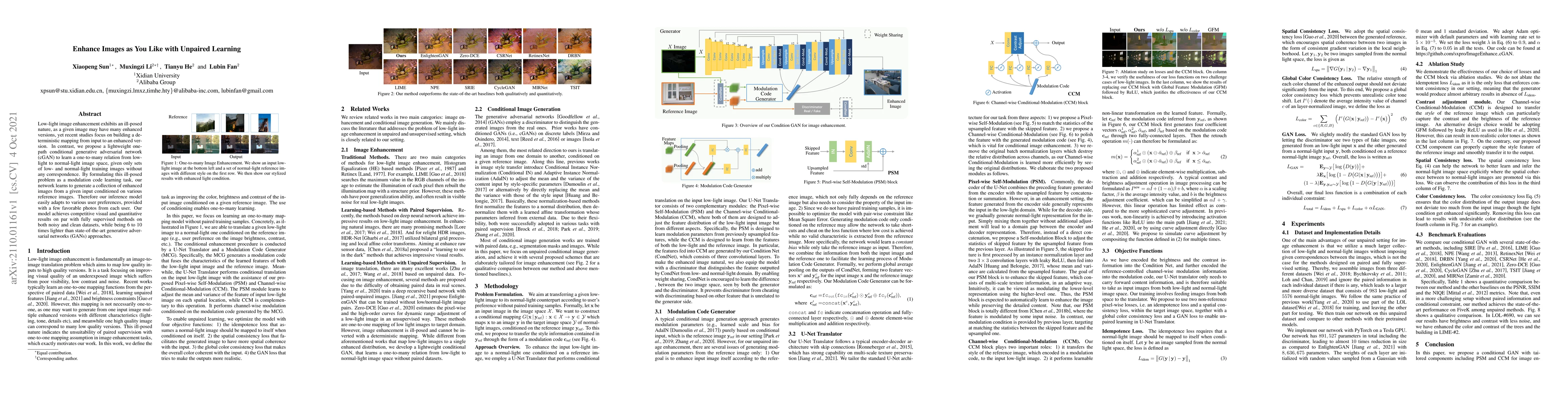 Low-light image enhancement exhibits an ill-posed nature, as a given image may have many enhanced versions, yet recent studies focus on building a deterministic mapping from input to an enhanced version. In contrast, we propose a lightweight one-path conditional generative adversarial network (cGAN) to learn a one-to-many relation from low-light to normal-light image space, given only sets of low- and normal-light training images without any correspondence. By formulating this ill-posed problem as a modulation code learning task, our network learns to generate a collection of enhanced images from a given input conditioned on various reference images. Therefore our inference model easily adapts to various user preferences, provided with a few favorable photos from each user. Our model achieves competitive visual and quantitative results on par with fully supervised methods on both noisy and clean datasets, while being 6 to 10 times lighter than state-of-the-art generative adversarial networks (GANs) approaches.