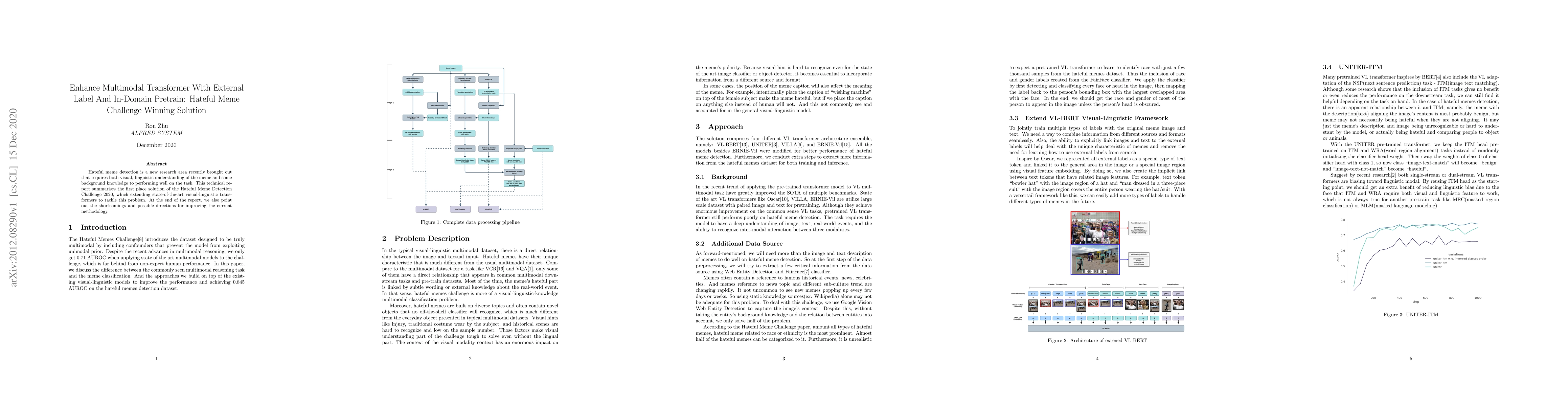 This paper presents the winning solution for the 2020 Hateful Meme Detection Challenge, enhancing multimodal transformers with external labels and in-domain pretraining to improve visual and linguistic understanding of memes. The authors discuss the limitations of the current approach and suggest future improvements.