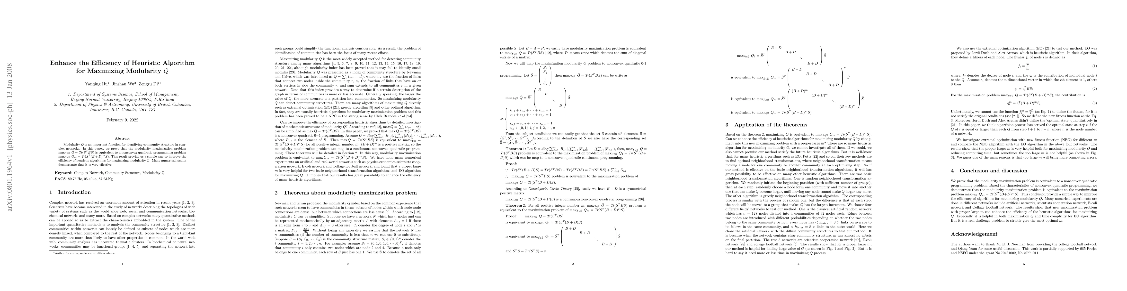 Modularity Q is an important function for identifying community structure in complex networks. In this paper, we prove that the modularity maximization problem is equivalent to a nonconvex quadratic programming problem. This result provide us a simple way to improve the efficiency of heuristic algorithms for maximizing modularity Q. Many numerical results demonstrate that it is very effective.