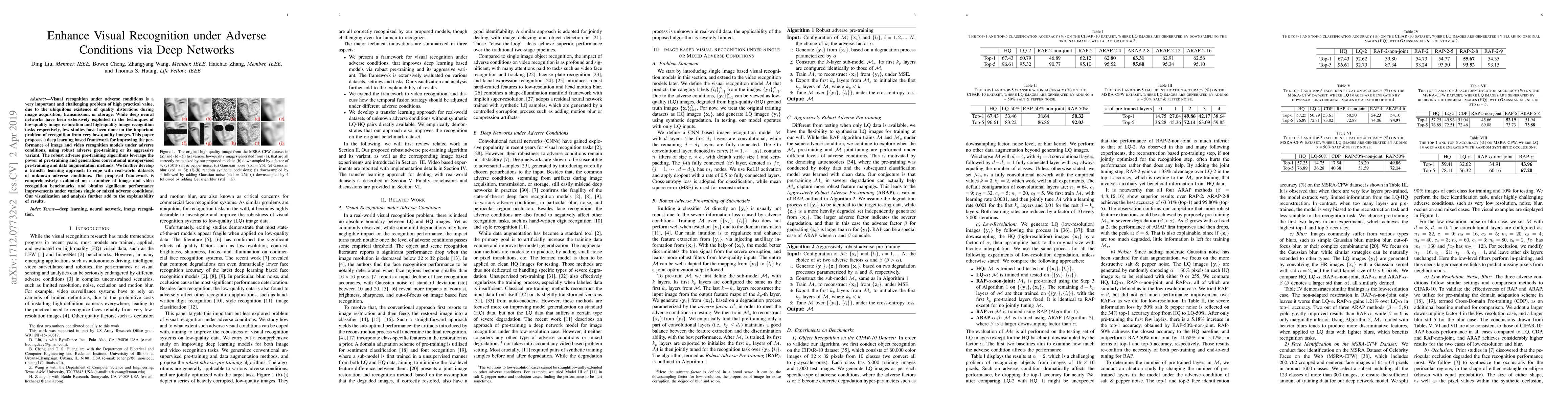 Visual recognition under adverse conditions is a very important and challenging problem of high practical value, due to the ubiquitous existence of quality distortions during image acquisition, transmission, or storage. While deep neural networks have been extensively exploited in the techniques of low-quality image restoration and high-quality image recognition tasks respectively, few studies have been done on the important problem of recognition from very low-quality images. This paper proposes a deep learning based framework for improving the performance of image and video recognition models under adverse conditions, using robust adverse pre-training or its aggressive variant. The robust adverse pre-training algorithms leverage the power of pre-training and generalizes conventional unsupervised pre-training and data augmentation methods. We further develop a transfer learning approach to cope with real-world datasets of unknown adverse conditions. The proposed framework is comprehensively evaluated on a number of image and video recognition benchmarks, and obtains significant performance improvements under various single or mixed adverse conditions. Our visualization and analysis further add to the explainability of results.