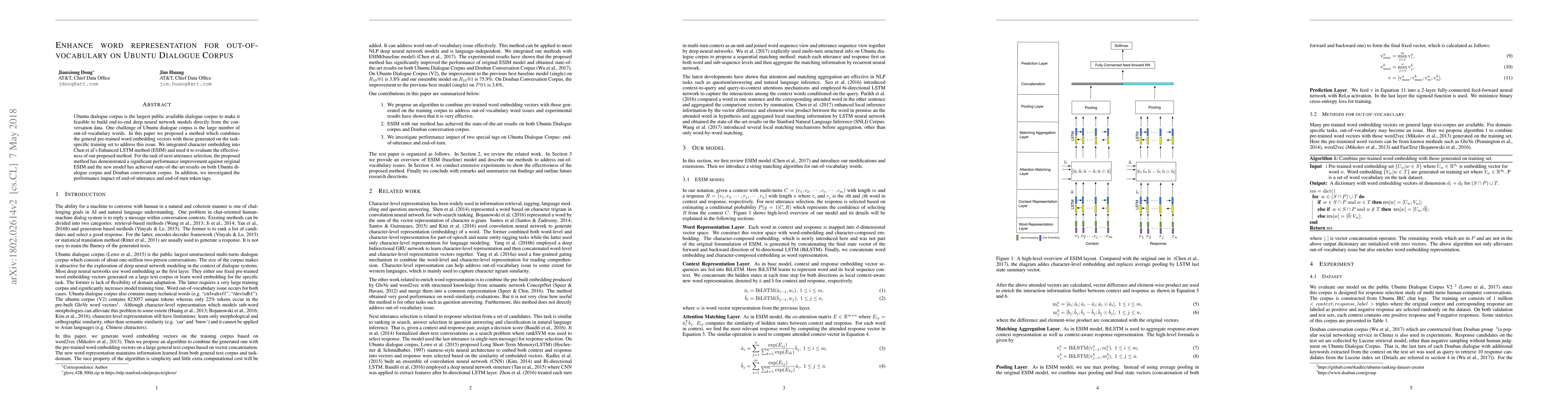 This paper proposes a method to enhance word representation for out-of-vocabulary words in the Ubuntu dialogue corpus by integrating character embeddings into the Enhanced LSTM method (ESIM). The new approach achieves state-of-the-art results in next utterance selection and demonstrates significant performance improvements over the original ESIM model.