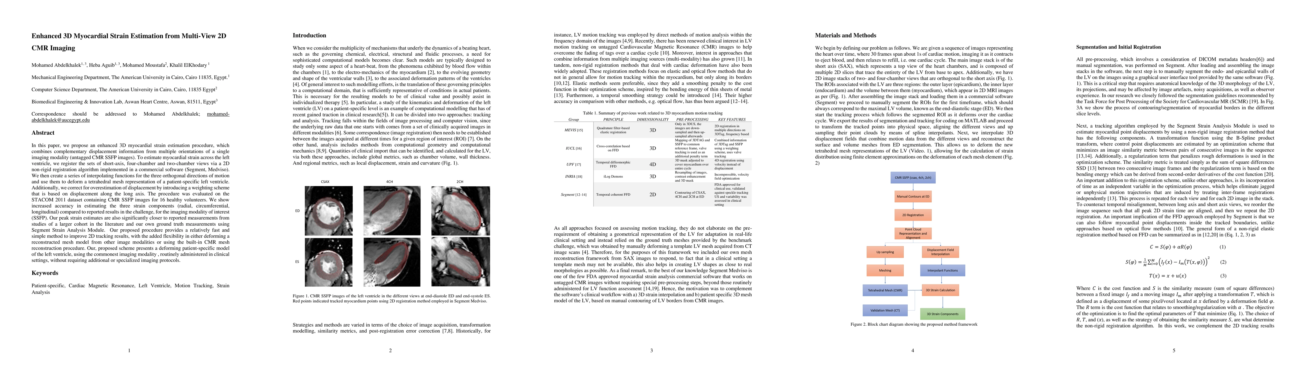 This paper proposes an enhanced 3D myocardial strain estimation method using multi-view 2D CMR imaging to improve accuracy. The method combines displacement information from short-axis, four-chamber, and two-chamber views, and corrects for overestimation with a weighting scheme, showing improved strain component estimates compared to existing methods.