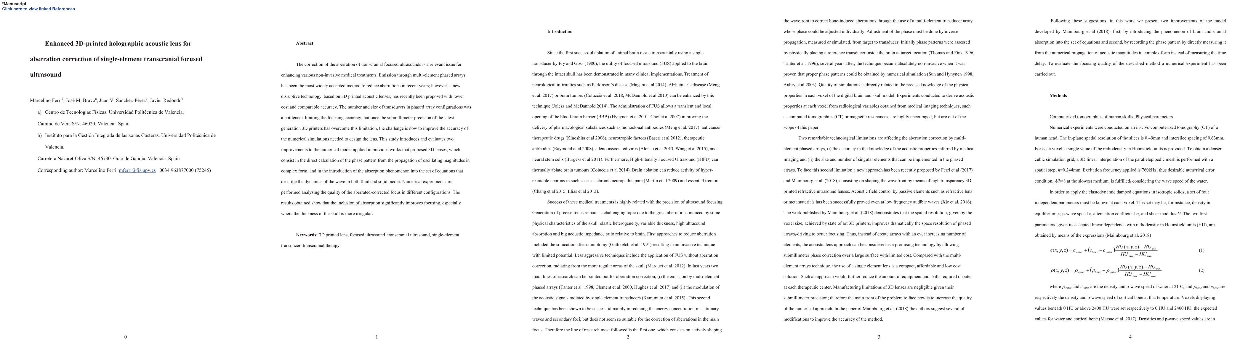 The correction of the aberration of transcranial focused ultrasounds is a relevant issue for enhancing various non-invasive medical treatments. Emission through multi-element phased arrays has been the most widely accepted method to reduce aberrations in recent years; however, a new disruptive technology, based on 3D printed acoustic lenses, has recently been proposed with lower cost and comparable accuracy. The number and size of transducers in phased array configurations was a bottleneck limiting the focusing accuracy, but once the submillimeter precision of the latest generation 3D printers has overcome this limitation, the challenge is now to improve the accuracy of the numerical simulations needed to design the lens. This study introduces and evaluates two improvements to the numerical model applied in previous works that proposed 3D lenses, which consist in the direct calculation of the phase pattern from the propagation of oscillating magnitudes in complex form, and in the introduction of the absorption phenomenon into the set of equations that describe the dynamics of the wave in both fluid and solid media. Numerical experiments are performed analysing the quality of the aberrated-corrected focus in different configurations. The results obtained show that the inclusion of absorption significantly improves focusing, especially where the thickness of the skull is more irregular.