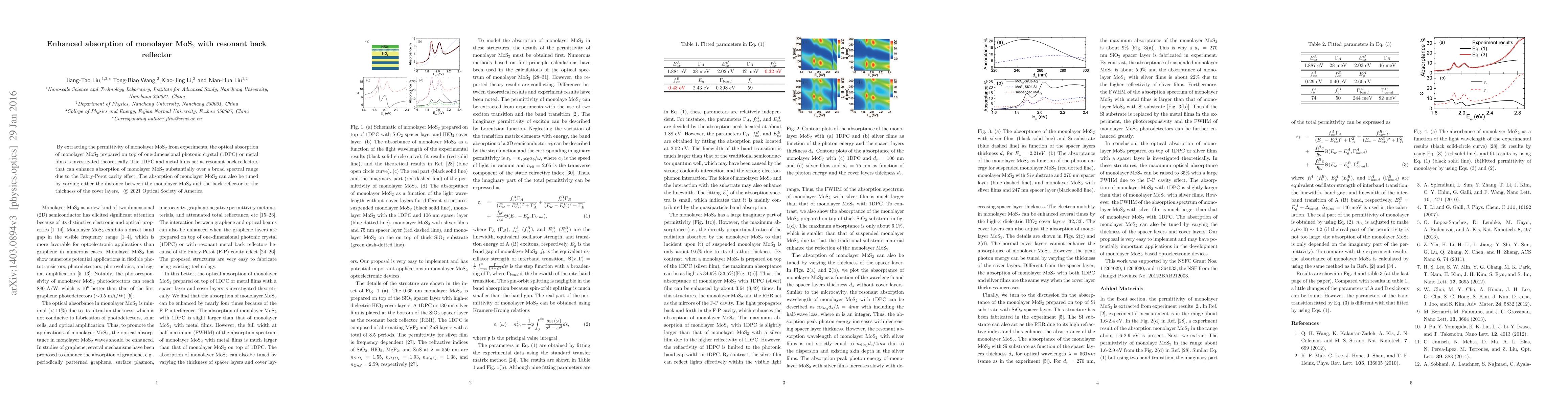 This study investigates how a one-dimensional photonic crystal (1DPC) or metal film acting as a resonant back reflector can significantly enhance the optical absorption of monolayer MoS2 through the Fabry-Perot cavity effect, with absorption tunable by adjusting the distance to the reflector or the thickness of cover layers.