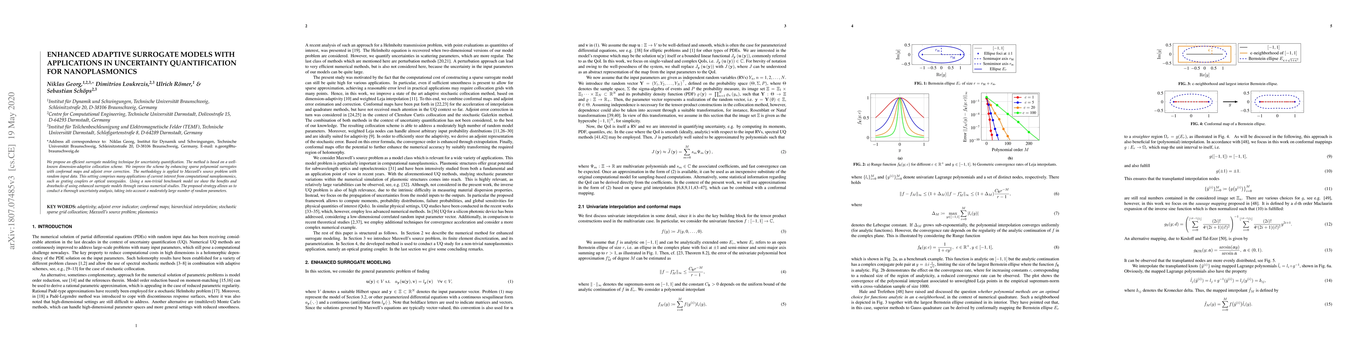 This paper introduces an advanced adaptive surrogate modeling technique for uncertainty quantification in nanoplasmonics, employing enhanced sparse polynomial surrogates and conformal maps. The method is demonstrated through Maxwell's source problem with random inputs, showcasing its effectiveness in computational nanoplasmonics applications.