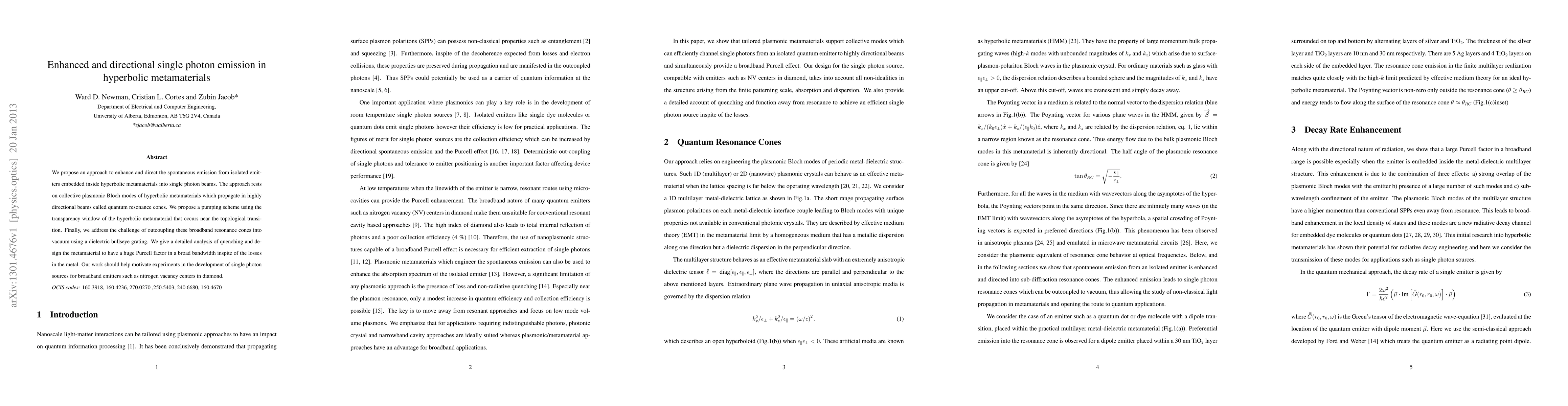 This paper proposes an innovative method to enhance and direct single photon emission from isolated emitters using hyperbolic metamaterials, leveraging their collective plasmonic Bloch modes and quantum resonance cones. The approach includes a pumping scheme near the material's topological transition and a dielectric bullseye grating to outcouple broadband resonance cones, aiming to develop efficient single photon sources for applications like nitrogen vacancy centers in diamond.