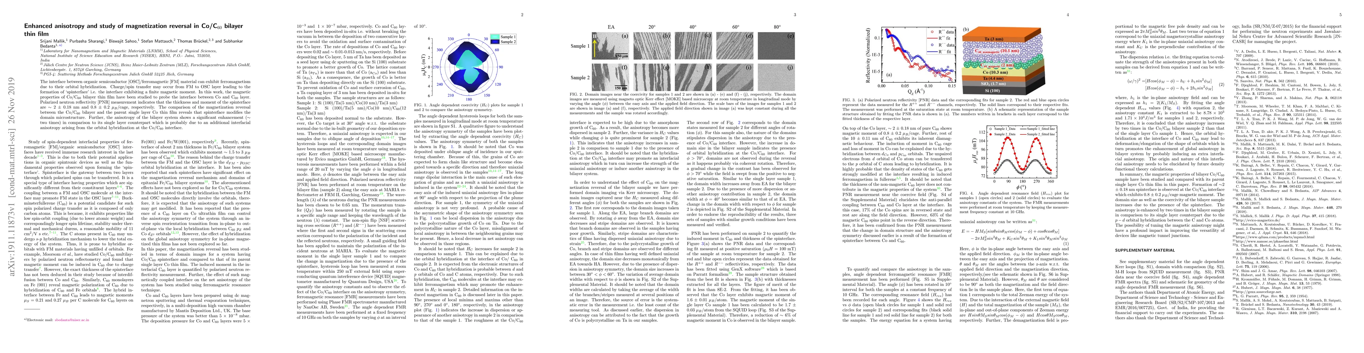 This study investigates the magnetic properties of Co/C$_{60}$ bilayer thin films, revealing an enhanced anisotropy due to orbital hybridization at the interface, and demonstrates that the spinterface formed alters the domain microstructure and magnetization reversal compared to single-layer Co.