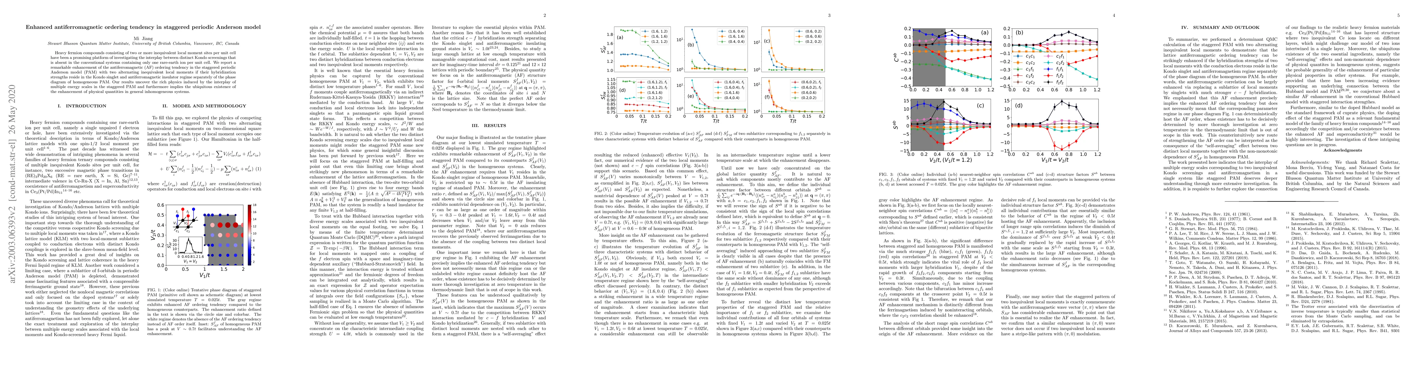 Heavy fermion compounds consisting of two or more inequivalent local moment sites per unit cell have been a promising platform of investigating the interplay between distinct Kondo screenings that is absent in the conventional systems containing only one rare-earth ion per unit cell. We report a remarkable enhancement of the antiferromagnetic (AF) ordering tendency in the staggered periodic Anderson model (PAM) with two alternating inequivalent local moments if their hybridization strengths reside in the Kondo singlet and antiferromagnetic insulator regime separately of the phase diagram of homogeneous PAM. Our results uncover the rich physics induced by the interplay of multiple energy scales in the staggered PAM and furthermore implies the ubiquitous existence of the enhancement of physical quantities in general inhomogeneous systems.