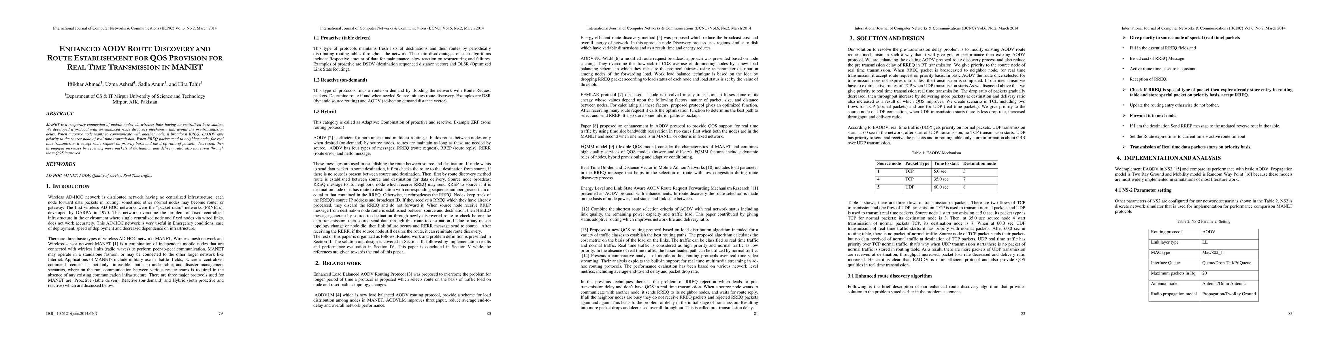 Title: Enhanced AODv Route Discovery and Route Establishment for QoS Provision for Real Time Transmission in MANET Summary: This paper proposes an enhanced protocol for MANETs that prioritizes real-time transmission by improving route discovery to reduce pre-transmission delay, resulting in increased throughput, packet delivery ratio, and overall QoS.