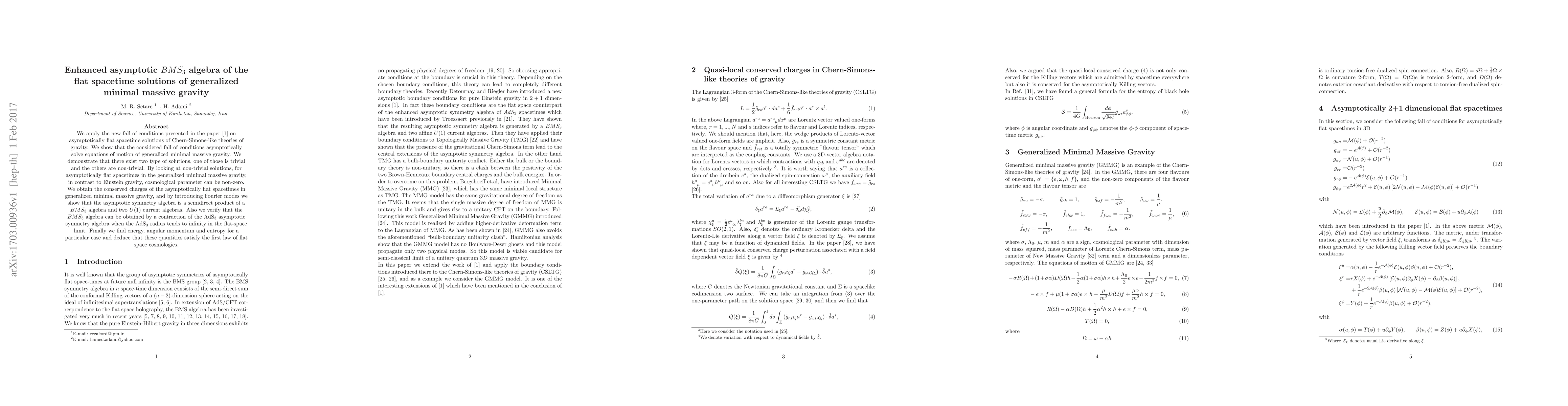 We apply the new fall of conditions presented in the paper \cite{10} on asymptotically flat spacetime solutions of Chern-Simons-like theories of gravity. We show that the considered fall of conditions asymptotically solve equations of motion of generalized minimal massive gravity. We demonstrate that there exist two type of solutions, one of those is trivial and the others are non-trivial. By looking at non-trivial solutions, for asymptotically flat spacetimes in the generalized minimal massive gravity, in contrast to Einstein gravity, cosmological parameter can be non-zero. We obtain the conserved charges of the asymptotically flat spacetimes in generalized minimal massive gravity, and by introducing Fourier modes we show that the asymptotic symmetry algebra is a semidirect product of a $BMS_{3}$ algebra and two $U(1)$ current algebras. Also we verify that the $BMS_{3}$ algebra can be obtained by a contraction of the AdS$_3$ asymptotic symmetry algebra when the AdS$_3$ radius tends to infinity in the flat-space limit. Finally we find energy, angular momentum and entropy for a particular case and deduce that these quantities satisfy the first law of flat space cosmologies.