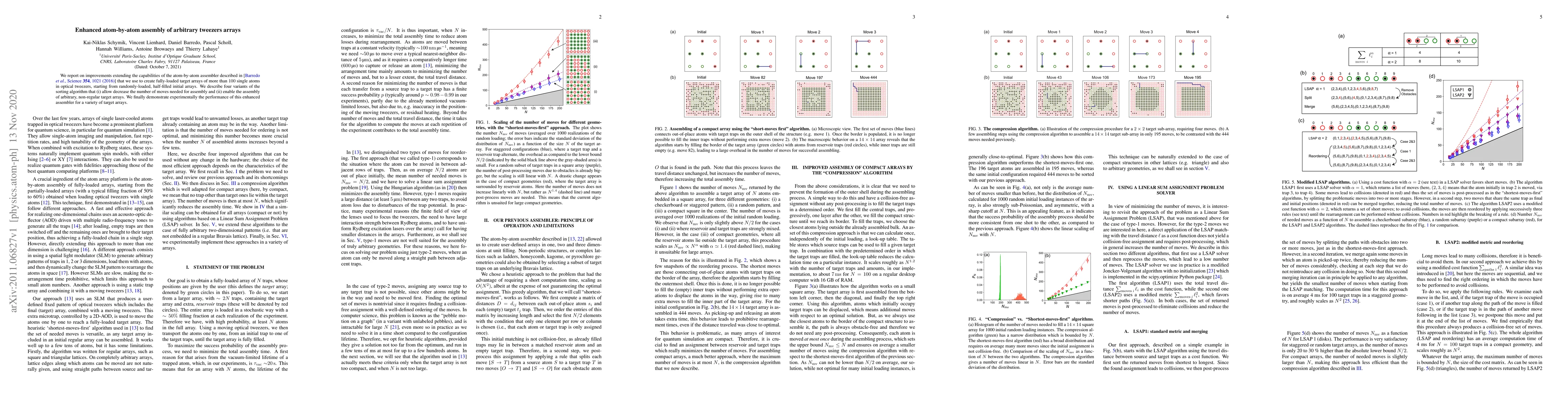 We report on improvements extending the capabilities of the atom-by-atom assembler described in [Barredo et al., Science 354, 1021 (2016)] that we use to create fully-loaded target arrays of more than 100 single atoms in optical tweezers, starting from randomly-loaded, half-filled initial arrays. We describe four variants of the sorting algorithm that (i) allow decrease the number of moves needed for assembly and (ii) enable the assembly of arbitrary, non-regular target arrays. We finally demonstrate experimentally the performance of this enhanced assembler for a variety of target arrays.