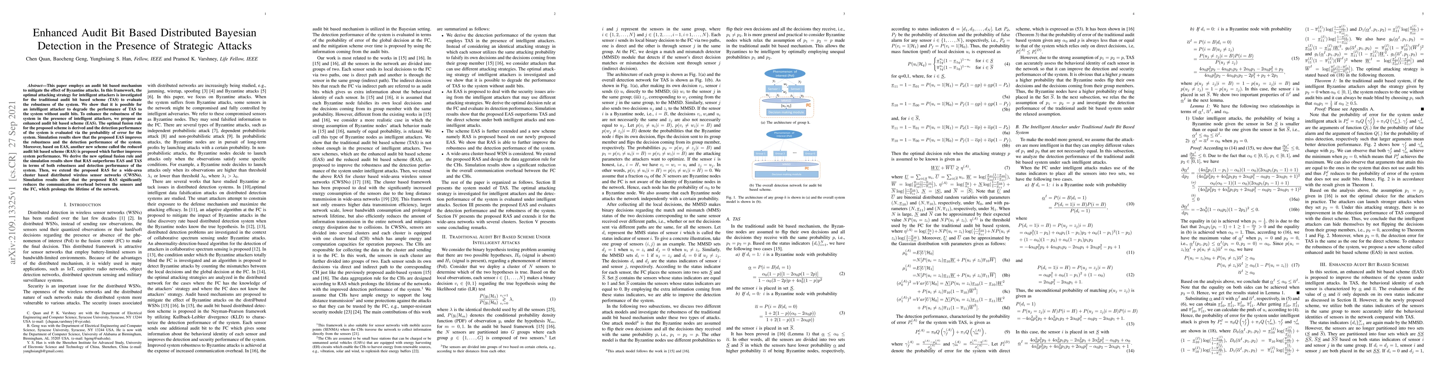 This paper proposes an enhanced audit bit based scheme (EAS) to improve the robustness of distributed Bayesian detection against Byzantine attacks, and further introduces a reduced audit bit based scheme (RAS) that enhances performance and reduces communication overhead in wide-area cluster-based distributed wireless sensor networks. Simulation results demonstrate that RAS outperforms EAS and traditional schemes in terms of robustness and detection performance.