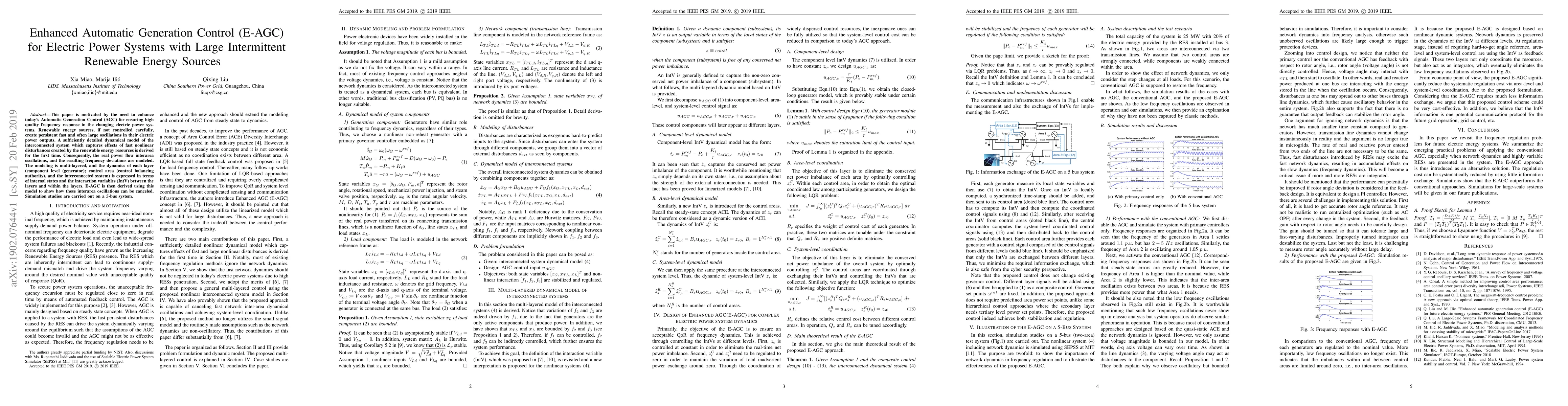 This paper is motivated by the need to enhance today's Automatic Generation Control (AGC) for ensuring high quality frequency response in the changing electric power systems. Renewable energy sources, if not controlled carefully, create persistent fast and often large oscillations in their electric power outputs. A sufficiently detailed dynamical model of the interconnected system which captures the effects of fast nonlinear disturbances created by the renewable energy resources is derived for the first time. Consequently, the real power flow interarea oscillations and the resulting frequency deviations are modeled. The modeling is multi-layered, and the dynamics of each layer (component level (generator); control area (control balancing authority), and the interconnected system) is expressed in terms of internal states and the interaction variables (IntV) between the layers and within the layers. E-AGC is then derived using this model to show how these interarea oscillations can be canceled. Simulation studies are carried out on a 5-bus system.