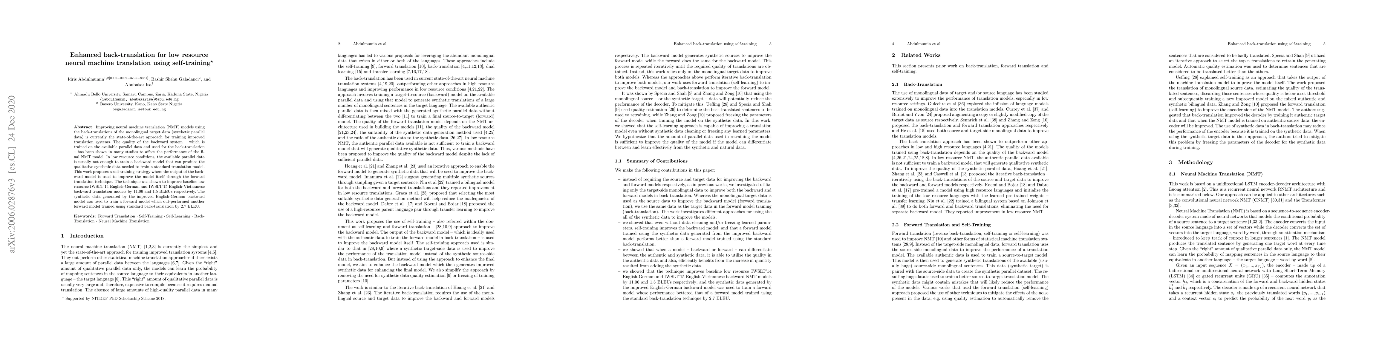 This paper proposes a self-training strategy to enhance back-translation for low resource neural machine translation, improving the backward model's output to generate better synthetic data. The technique achieved notable BLEU score improvements in low resource settings for English-German and English-Vietnamese translations.