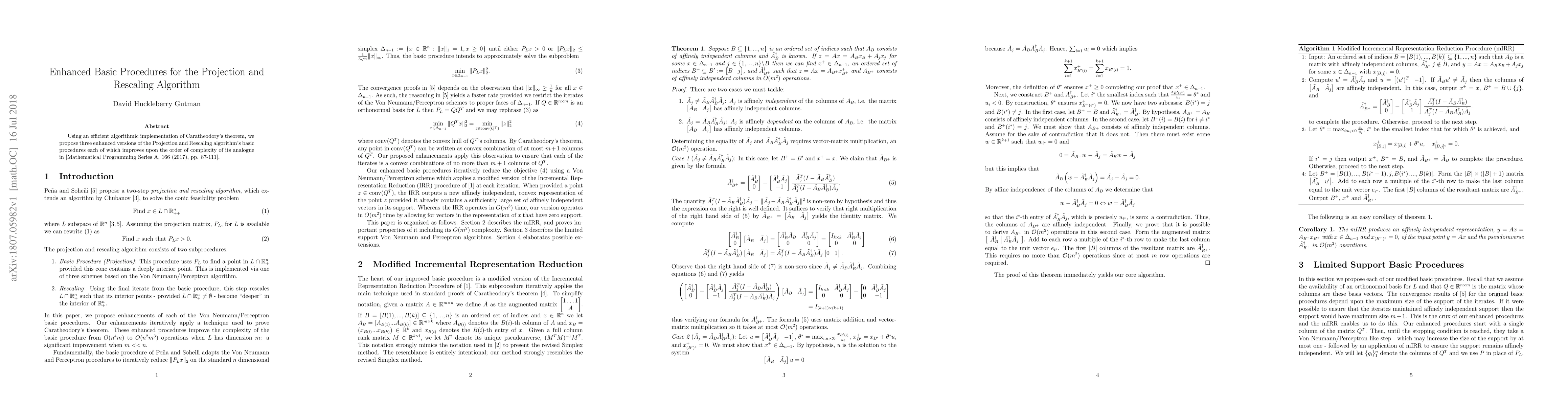 Using an efficient algorithmic implementation of Caratheodory's theorem, we propose three enhanced versions of the Projection and Rescaling algorithm's basic procedures each of which improves upon the order of complexity of its analogue in [Mathematical Programming Series A, 166 (2017), pp. 87-111].