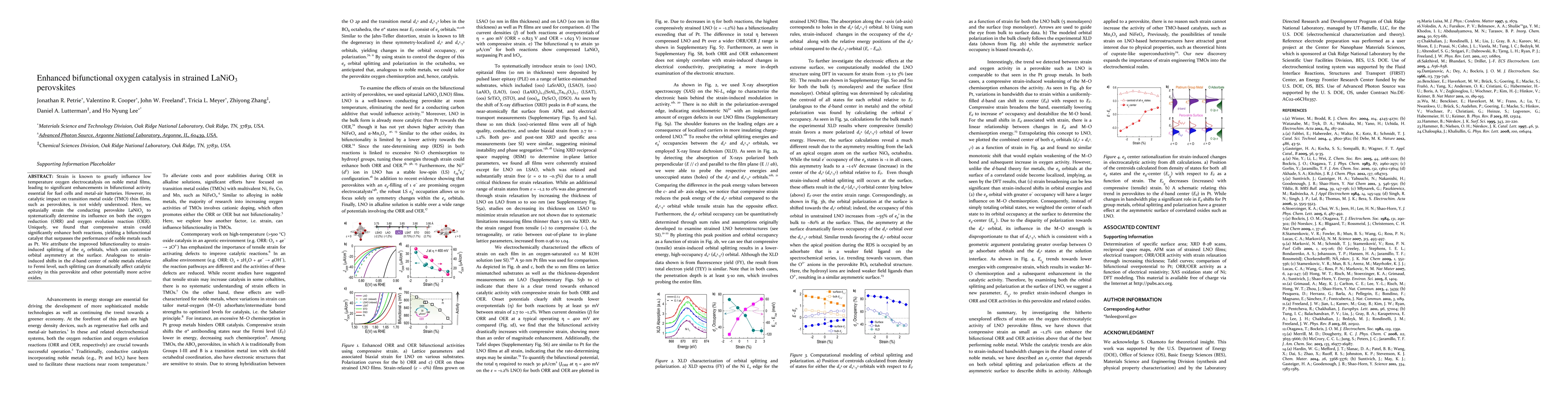 This paper investigates how compressive strain in LaNiO3 perovskites enhances bifunctional oxygen catalysis, surpassing the performance of noble metals like Pt. The study finds that strain-induced splitting of the eg orbitals improves both oxygen reduction and evolution reactions, attributing the enhanced activity to customized orbital asymmetry at the surface.