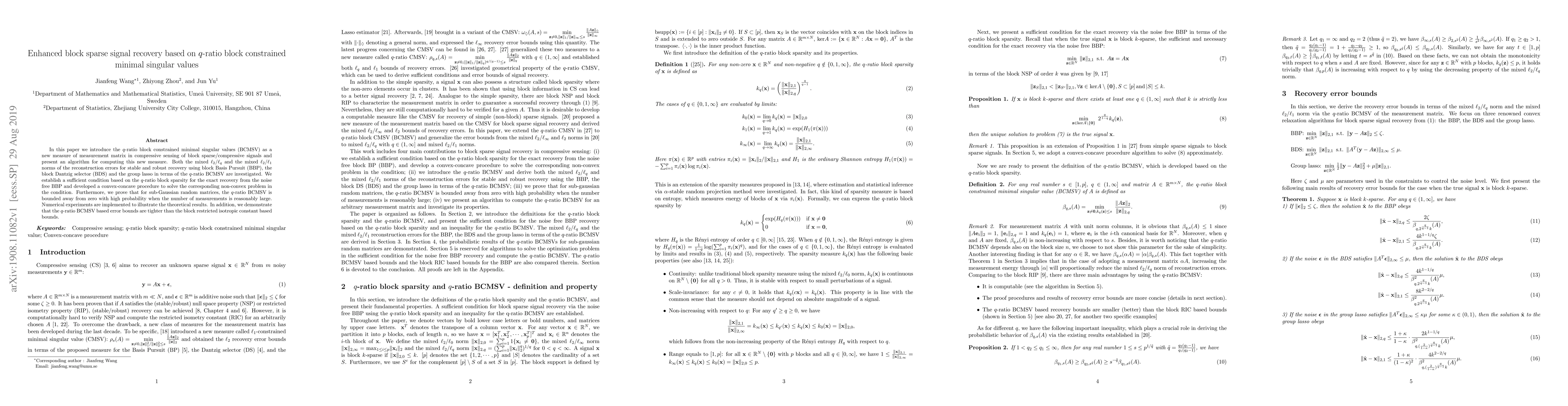 This paper introduces a new measure called $q$-ratio block constrained minimal singular values (BCMSV) for measurement matrices in compressive sensing, presenting an algorithm to compute it. It investigates reconstruction error norms for stable and robust recovery using block-based methods and proves a sufficient condition for exact recovery, showing tighter error bounds compared to existing methods.