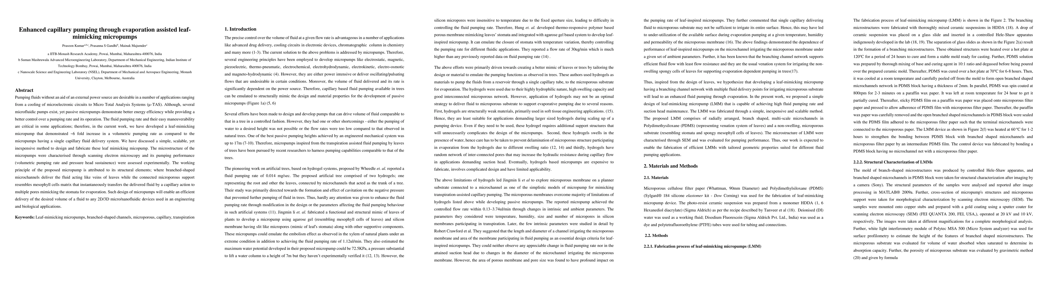 Pumping fluids without an aid of an external power source are desirable in a number of applications ranging from a cooling of microelectronic circuits to Micro Total Analysis Systems (micro-TAS). Although, several microfluidic pumps exist, yet passive micropumps demonstrate better energy efficiency while providing a better control over a pumping rate and its operation. The fluid pumping rate and their easy maneuverability are critical in some applications; therefore, in the current work, we have developed a leaf-mimicking micropump that demonstrated ~6 fold increase in a volumetric pumping rate as compared to the micropumps having a single capillary fluid delivery system. We have discussed a simple, scalable, yet inexpensive method to design and fabricate these leaf mimicking micopump. The microstructure of the micropumps were characterised through scanning electron microscopy and its pumping performance (volumetric pumping rate and pressure head sustainence) were assessed experimentally. The working principle of the proposed micropump is attributed to its structural elements; where branched-shaped microchannels deliver the fluid acting like veins of leaves while the connected microporous support resembles mesophyll cells matrix that instantaneously transfers the delivered fluid by a capillary action to multiple pores mimicking the stomata for evaporation. Such design of micropumps will enable an efficient delivery of the desired volume of a fluid to any 2D/3D micro/nanofluidic devices used in an engineering and biological applications.
