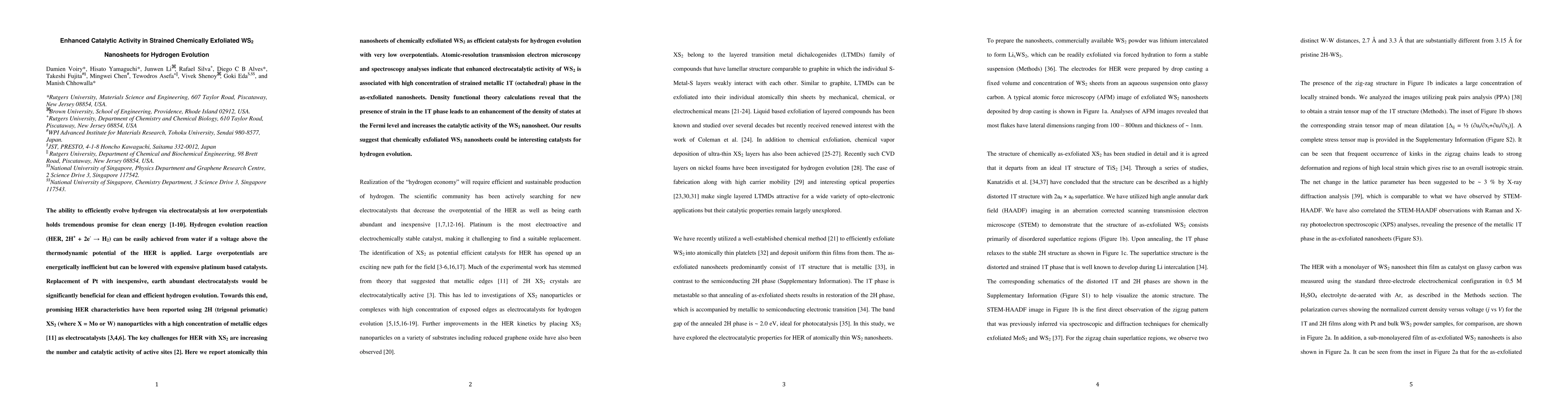 This paper reports that chemically exfoliated WS2 nanosheets exhibit enhanced catalytic activity for hydrogen evolution due to a high concentration of strained metallic 1T phase, which increases the density of states at the Fermi level, as demonstrated by atomic-resolution microscopy and DFT calculations. These findings suggest WS2 nanosheets as promising, low-overpotential catalysts for clean hydrogen production.