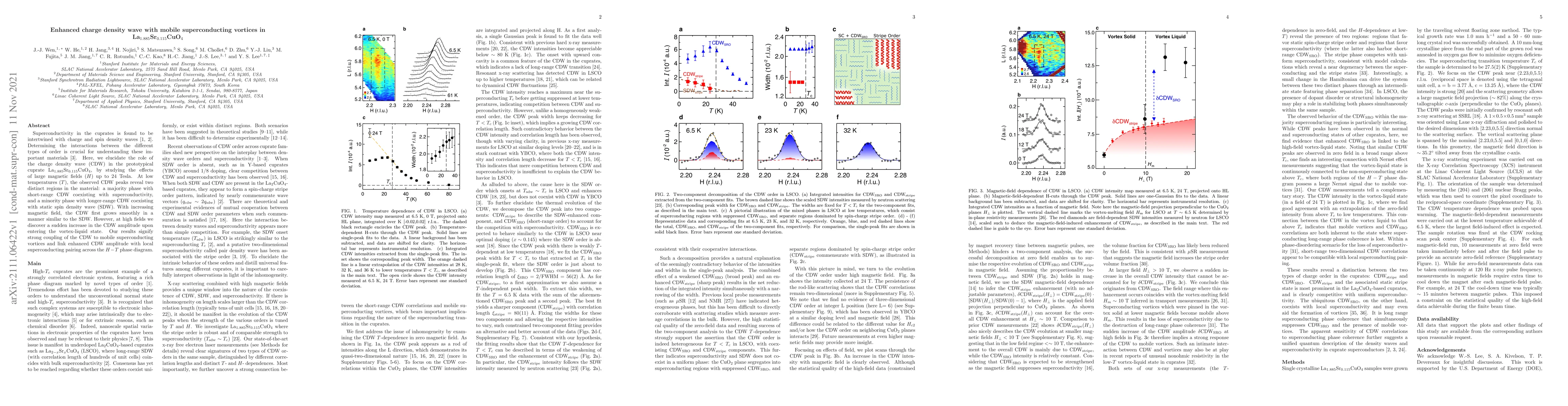 Superconductivity in the cuprates is found to be intertwined with charge and spin density waves. Determining the interactions between the different types of order is crucial for understanding these important materials. Here, we elucidate the role of the charge density wave (CDW) in the prototypical cuprate La$_{1.885}$Sr$_{0.115}$CuO$_4$, by studying the effects of large magnetic fields ($H$) up to 24 Tesla. At low temperatures ($T$), the observed CDW peaks reveal two distinct regions in the material: a majority phase with short-range CDW coexisting with superconductivity, and a minority phase with longer-range CDW coexisting with static spin density wave (SDW). With increasing magnetic field, the CDW first grows smoothly in a manner similar to the SDW. However, at high fields we discover a sudden increase in the CDW amplitude upon entering the vortex-liquid state. Our results signify strong coupling of the CDW to mobile superconducting vortices and link enhanced CDW amplitude with local superconducting pairing across the $H-T$ phase diagram.