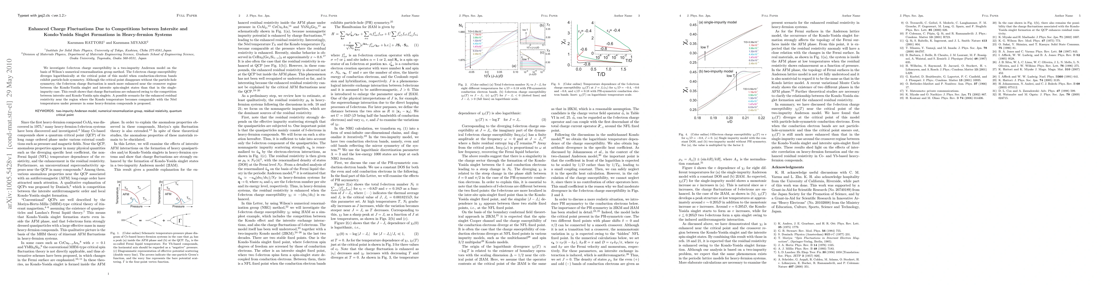 This paper explores f-electron charge susceptibility in a two-impurity Anderson model using Wilson's numerical renormalization group method, revealing enhanced charge fluctuations due to the competition between intersite and Kondo-Yosida singlet formations in heavy-fermion systems. The study proposes a scenario for increased residual resistivity near regions where Kondo and N\'eel temperatures are comparable under pressure.