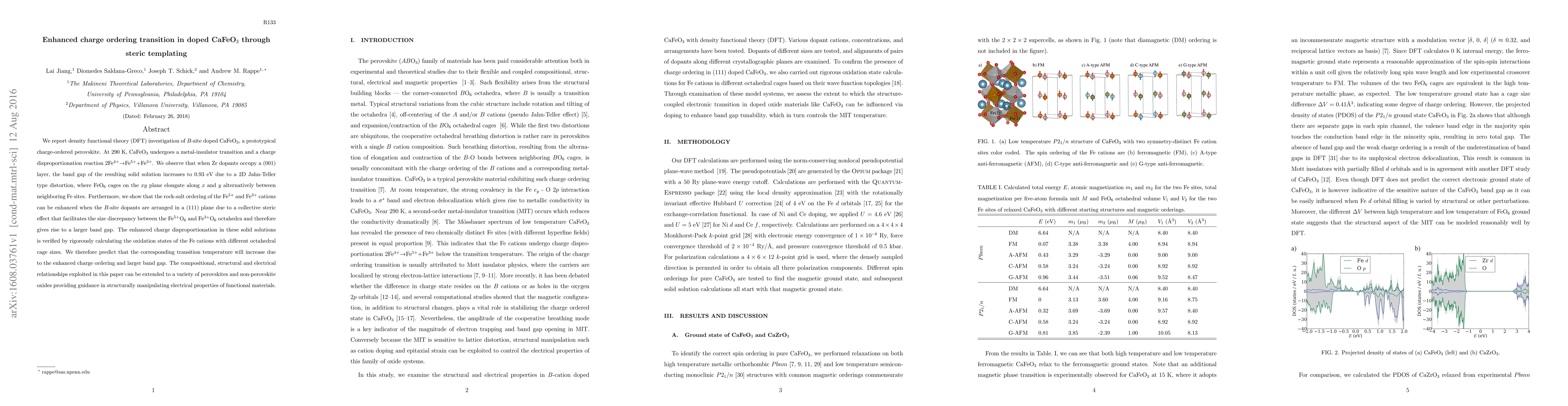 We report density functional theory (DFT) investigation of $B$-site doped CaFeO$_3$, a prototypical charge-ordered perovskite. At 290 K, CaFeO$_3$ undergoes a metal-insulator transition and a charge disproportionation reaction 2Fe$^{4+}$$\rightarrow$Fe$^{5+}$+Fe$^{3+}$. We observe that when Zr dopants occupy a (001) layer, the band gap of the resulting solid solution increases to 0.93 eV due to a 2D Jahn-Teller type distortion, where FeO$_6$ cages on the $xy$ plane elongate along $x$ and $y$ alternatively between neighboring Fe sites. Furthermore, we show that the rock-salt ordering of the Fe$^{5+}$ and Fe$^{3+}$ cations can be enhanced when the $B$-site dopants are arranged in a (111) plane due to a collective steric effect that facilitates the size discrepancy between the Fe$^{5+}$O$_6$ and Fe$^{3+}$O$_6$ octahedra and therefore gives rise to a larger band gap. The enhanced charge disproportionation in these solid solutions is verified by rigorously calculating the oxidation states of the Fe cations with different octahedral cage sizes. We therefore predict that the corresponding transition temperature will increase due to the enhanced charge ordering and larger band gap. The compositional, structural and electrical relationships exploited in this paper can be extended to a variety of perovskites and non-perovskite oxides providing guidance in structurally manipulating electrical properties of functional materials.