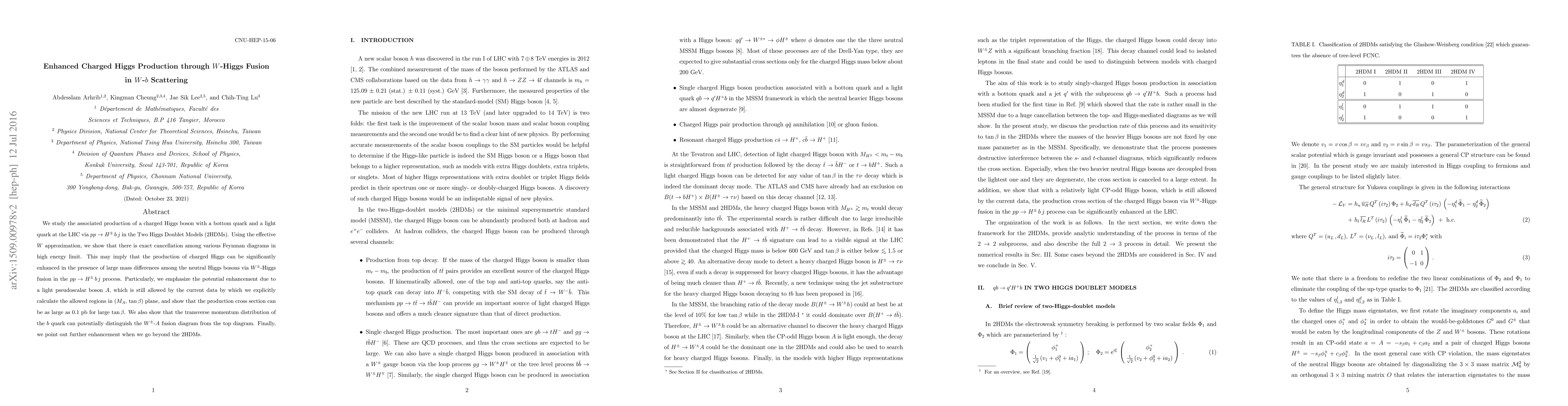 We study the associated production of a charged Higgs boson with a bottom quark and a light quark at the LHC via p p \to H^\pm\,b\,j in the Two Higgs Doublet Models (2HDMs). Using the effective W approximation, we show that there is exact cancellation among various Feynman diagrams in high energy limit. This may imply that the production of charged Higgs can be significantly enhanced in the presence of large mass differences among the neutral Higgs bosons via W^\pm-Higgs fusion in the p p \to H^\pm\,b\,j process. Particularly, we emphasize the potential enhancement due to a light pseudoscalar boson $A$, which is still allowed by the current data by which we explicitly calculate the allowed regions in (M_A,\,\tan\beta) plane, and show that the production cross section can be as large as 0.1 pb for large $\tan\beta$. We also show that the transverse momentum distribution of the b quark can potentially distinguish the W^\pm-A fusion diagram from the top diagram. Finally, we point out further enhancement when we go beyond the 2HDMs.