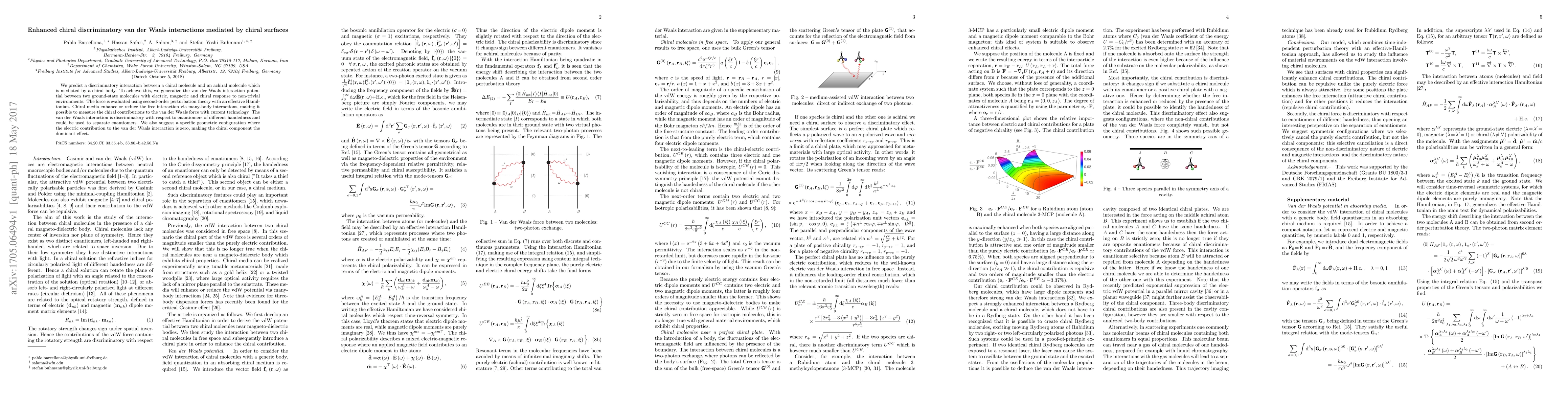 This paper predicts a chiral discriminatory interaction between chiral and achiral molecules mediated by a chiral surface, achieved through enhanced van der Waals interactions. The study uses second-order perturbation theory to evaluate these forces, revealing that chiral media can significantly influence the interaction, enabling the separation of enantiomers.