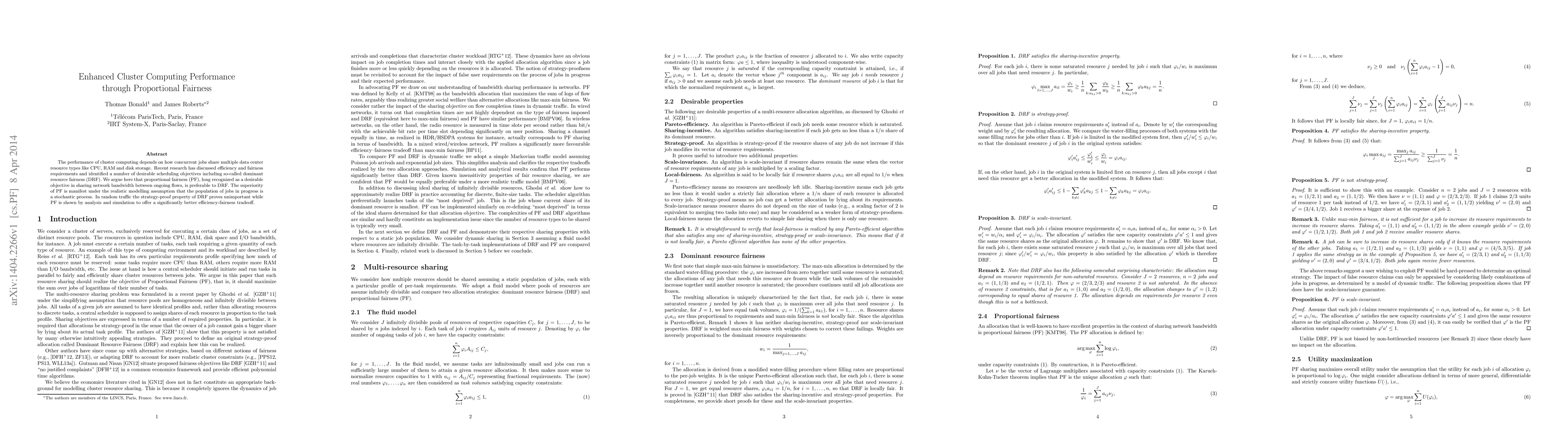 The performance of cluster computing depends on how concurrent jobs share multiple data center resource types like CPU, RAM and disk storage. Recent research has discussed efficiency and fairness requirements and identified a number of desirable scheduling objectives including so-called dominant resource fairness (DRF). We argue here that proportional fairness (PF), long recognized as a desirable objective in sharing network bandwidth between ongoing flows, is preferable to DRF. The superiority of PF is manifest under the realistic modelling assumption that the population of jobs in progress is a stochastic process. In random traffic the strategy-proof property of DRF proves unimportant while PF is shown by analysis and simulation to offer a significantly better efficiency-fairness tradeoff.