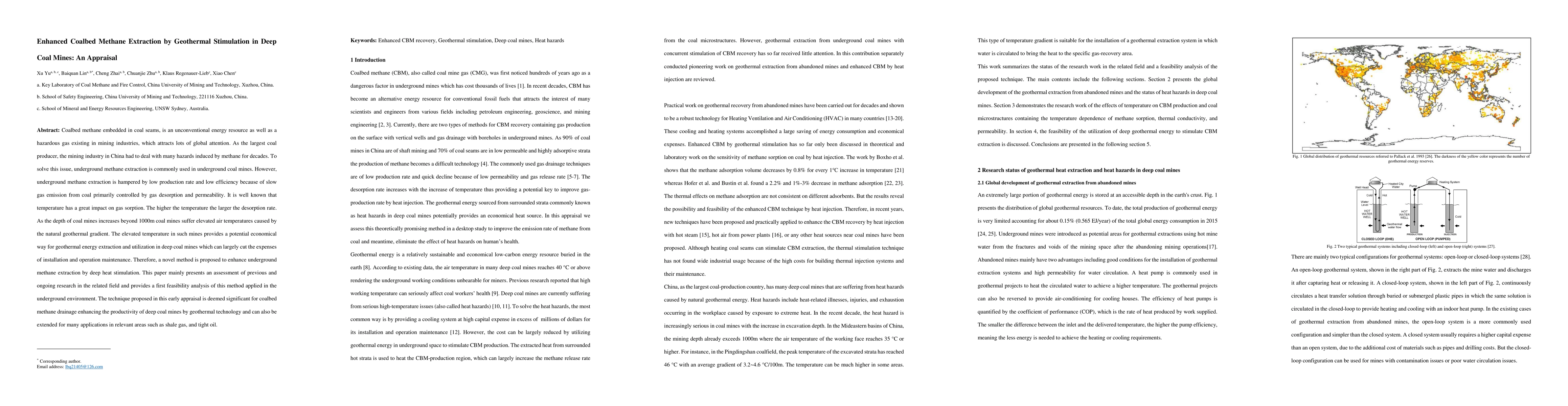 This paper assesses the feasibility of using geothermal stimulation to enhance coalbed methane extraction in deep coal mines, proposing a method to improve gas desorption and permeability through elevated temperatures. The study finds that geothermal energy utilization in deep mines can significantly boost methane extraction efficiency and reduce operational costs.