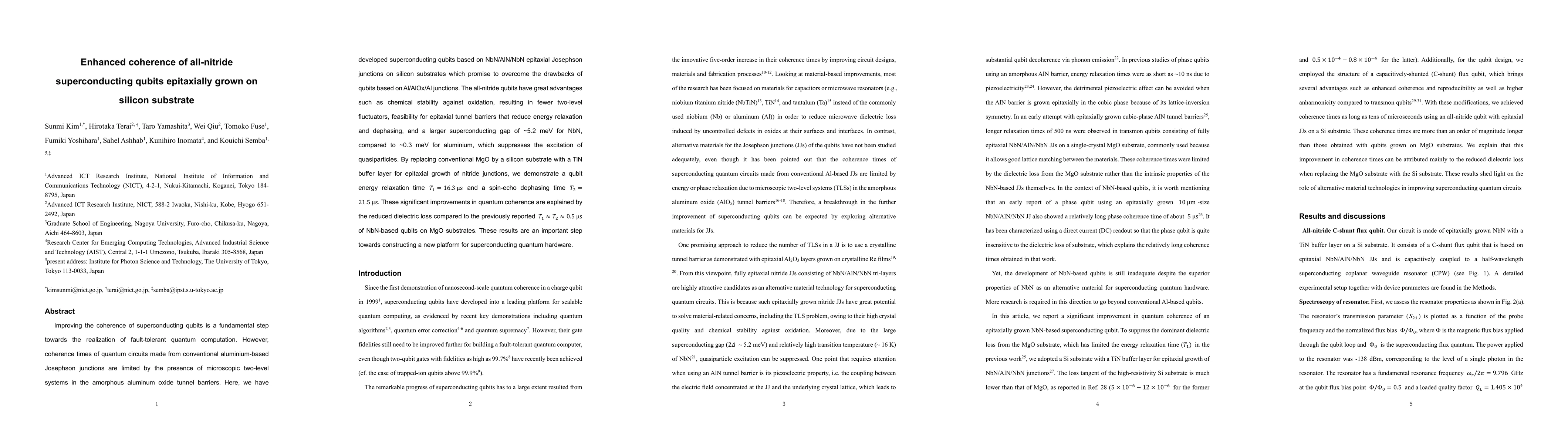 This paper reports the development of all-nitride superconducting qubits on silicon substrates, which show significantly enhanced coherence times compared to conventional aluminium-based qubits. The improved coherence is attributed to reduced dielectric loss and fewer two-level fluctuators due to the use of silicon as a substrate and epitaxial growth techniques.